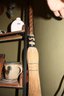 Decorative or functional hearth broom featuring a twisted wooden handle and natural straw bristles. Traditionally handmade, designed for sweeping ash and debris from fireplaces, or used as a rustic decorative accent in homes. Ideal for cabin-style interiors, primitive décor, or as part of a fireplace tool set.