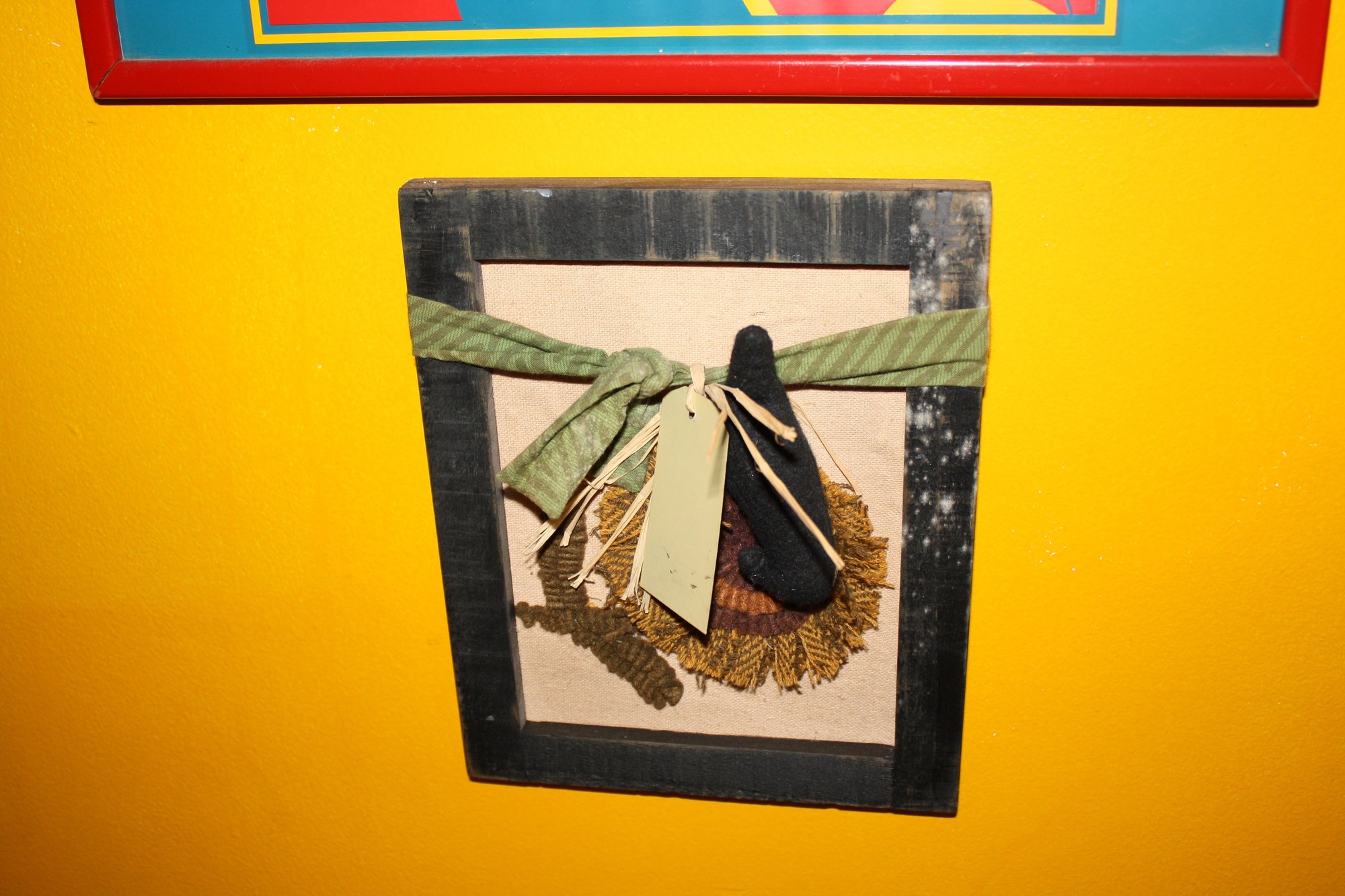 Handcrafted rustic wall hanging featuring mixed-media elements such as fabric, burlap, and natural materials mounted in a wooden frame. Includes a decorative fabric bow and a small tag as focal points. Designed to add a cozy, folk-art inspired touch to home interiors.