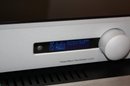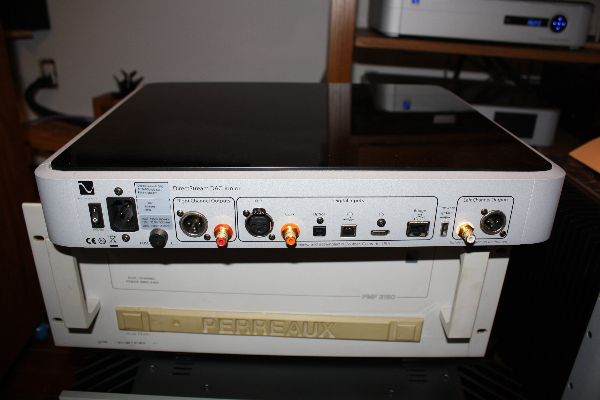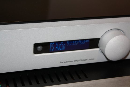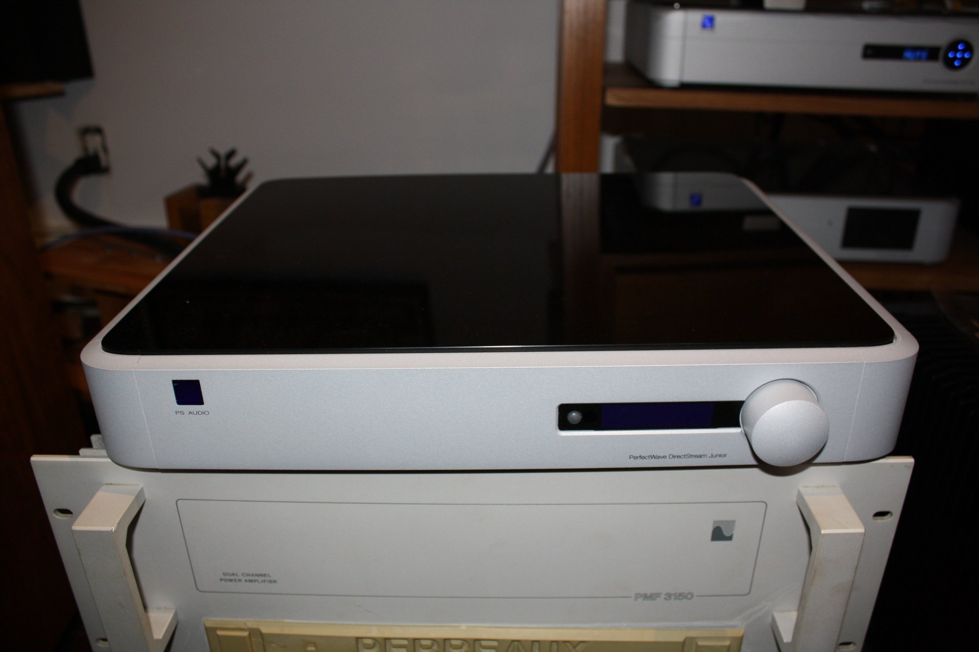 PS Audio PerfectWave DirectStream Junior digital-to-analog converter designed for high-performance audio playback, converting PCM and DSD signals into detailed analog output. Utilizes a Spartan 6 FPGA architecture instead of traditional DAC chips for advanced signal processing. Functions as a DAC, preamplifier, and media center with integrated Bridge II network card and Roon Ready streaming capability. Features a single-PCB layout and compact power supply design, originally retailed at approximately $3,999. Suitable for direct connection to power amplifiers in audiophile systems.