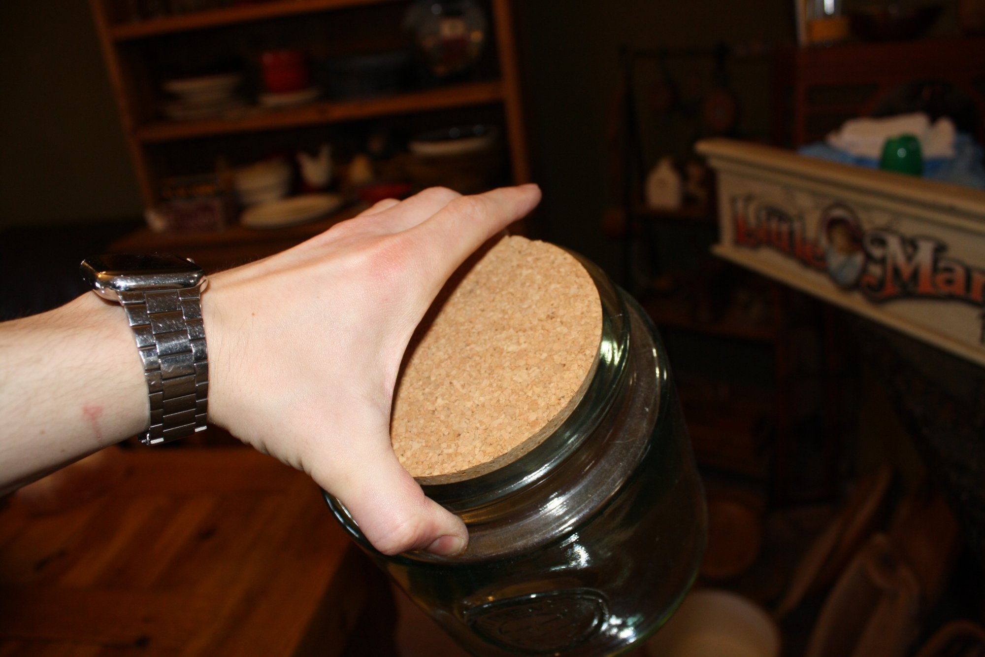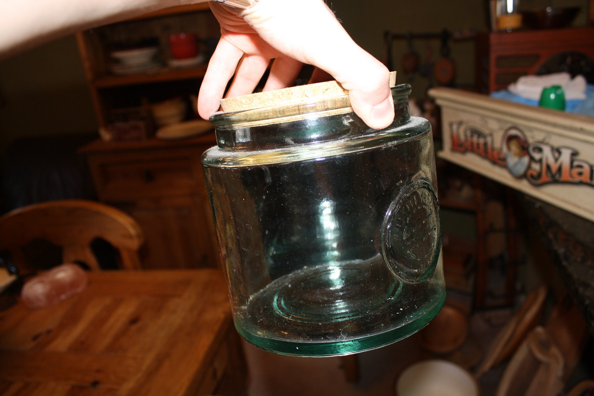 San Miguel authentic recycled glass jar made from 100% recycled green-tinted glass, featuring a cork lid and pressed “Authentic” stamp. Thick, durable glass with a rustic, retro aesthetic, ideal for storing dry foods such as pasta, spices, or coffee. Crafted in Spain, combines eco-friendly materials with functional and decorative kitchen storage.