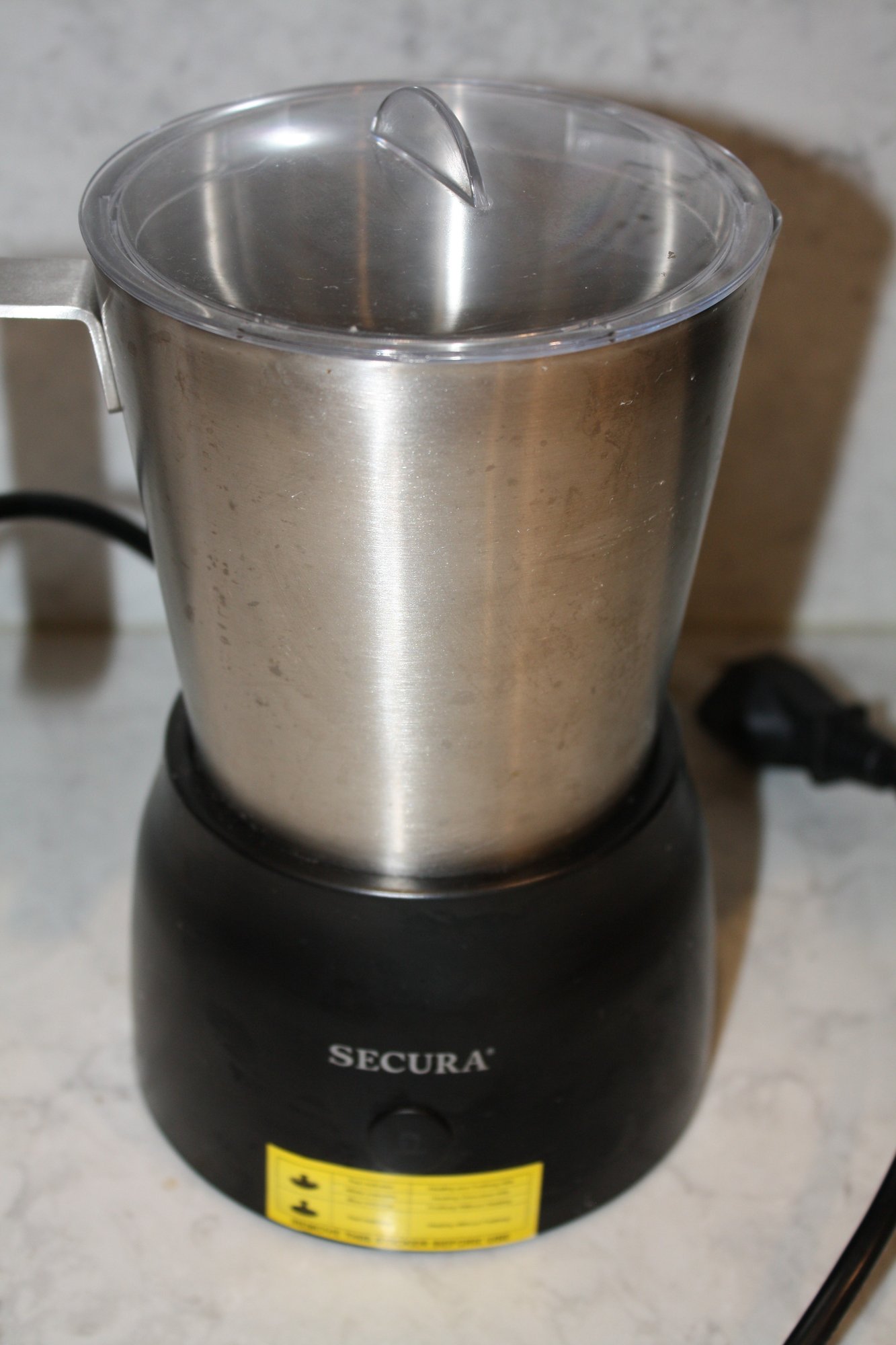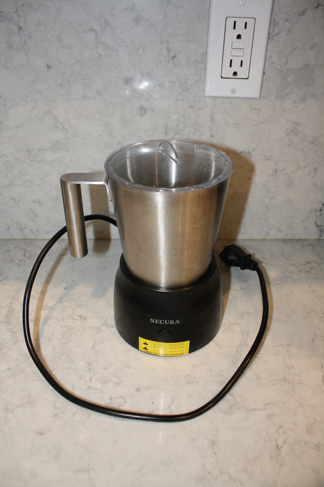Secura Automatic Milk Frother and Hot Chocolate Maker with 17-ounce (500ml) capacity, featuring a detachable stainless steel jug and dishwasher-safe components, designed to create hot milk foam, cold milk foam, hot chocolate, or warm milk with 4-in-1 functionality for home beverage preparation