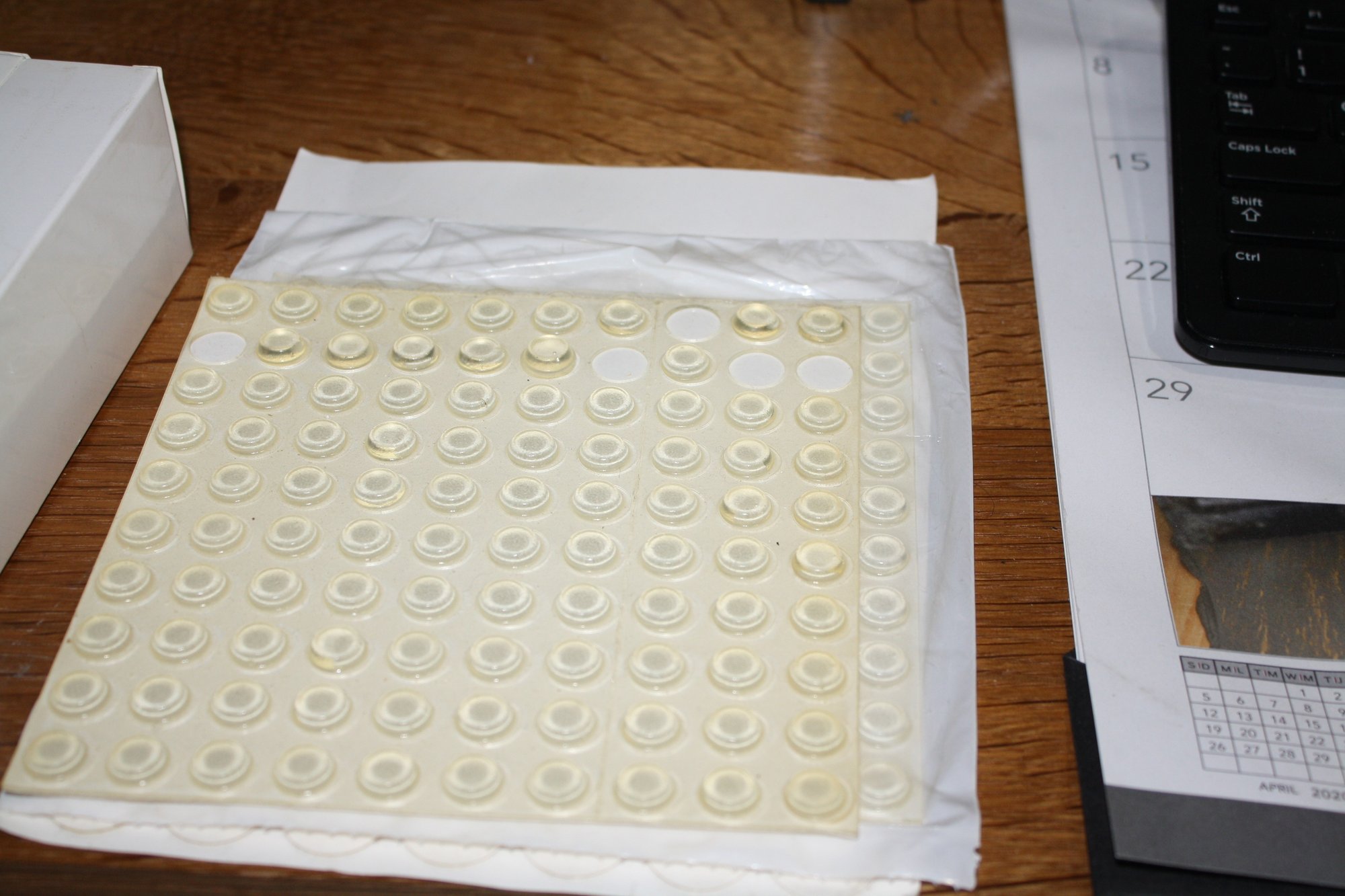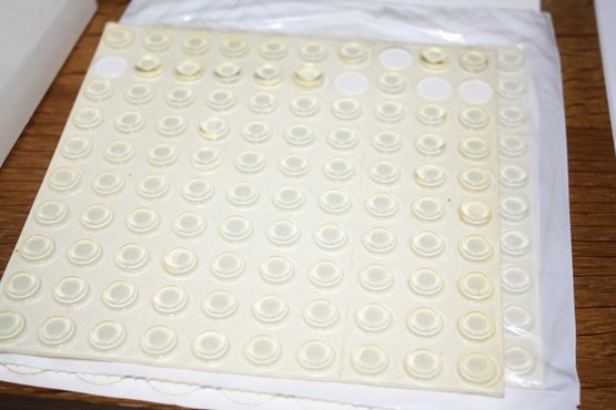 Self-adhesive rubber bumpon sheet consisting of clear polyurethane bumpers designed for use as feet, stops, and spacers on furniture, electronics, and household items to provide cushioning and surface protection.