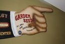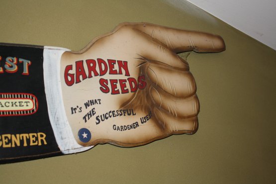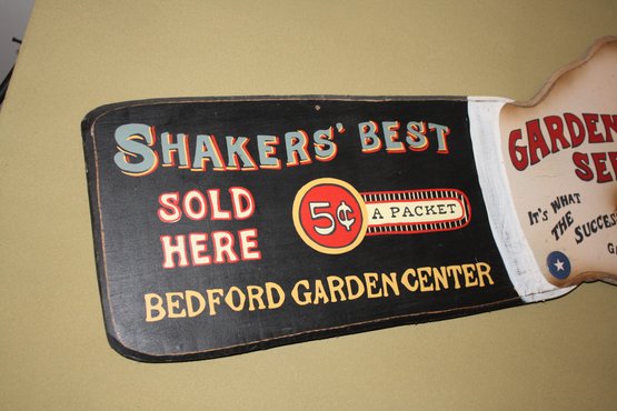 Vintage-style decorative advertising sign shaped like a pointing hand promoting “Shakers’ Best” garden seeds. The sign advertises seeds priced at 5¢ per packet and references the Bedford Garden Center. Features the slogan “It’s what the successful gardener uses,” with classic retro garden center graphics. Designed as a novelty wall décor piece suitable for garden sheds, greenhouses, or farmhouse-style interiors. 40" wide