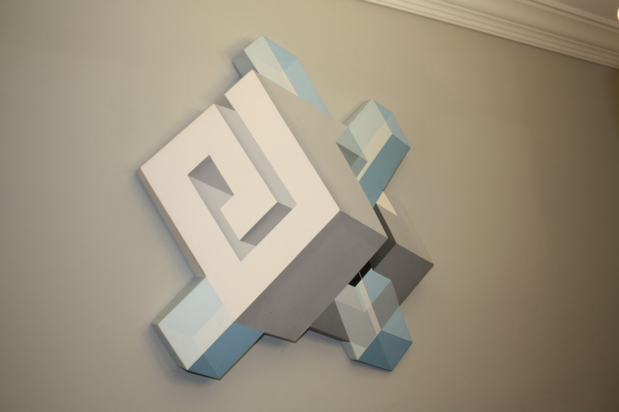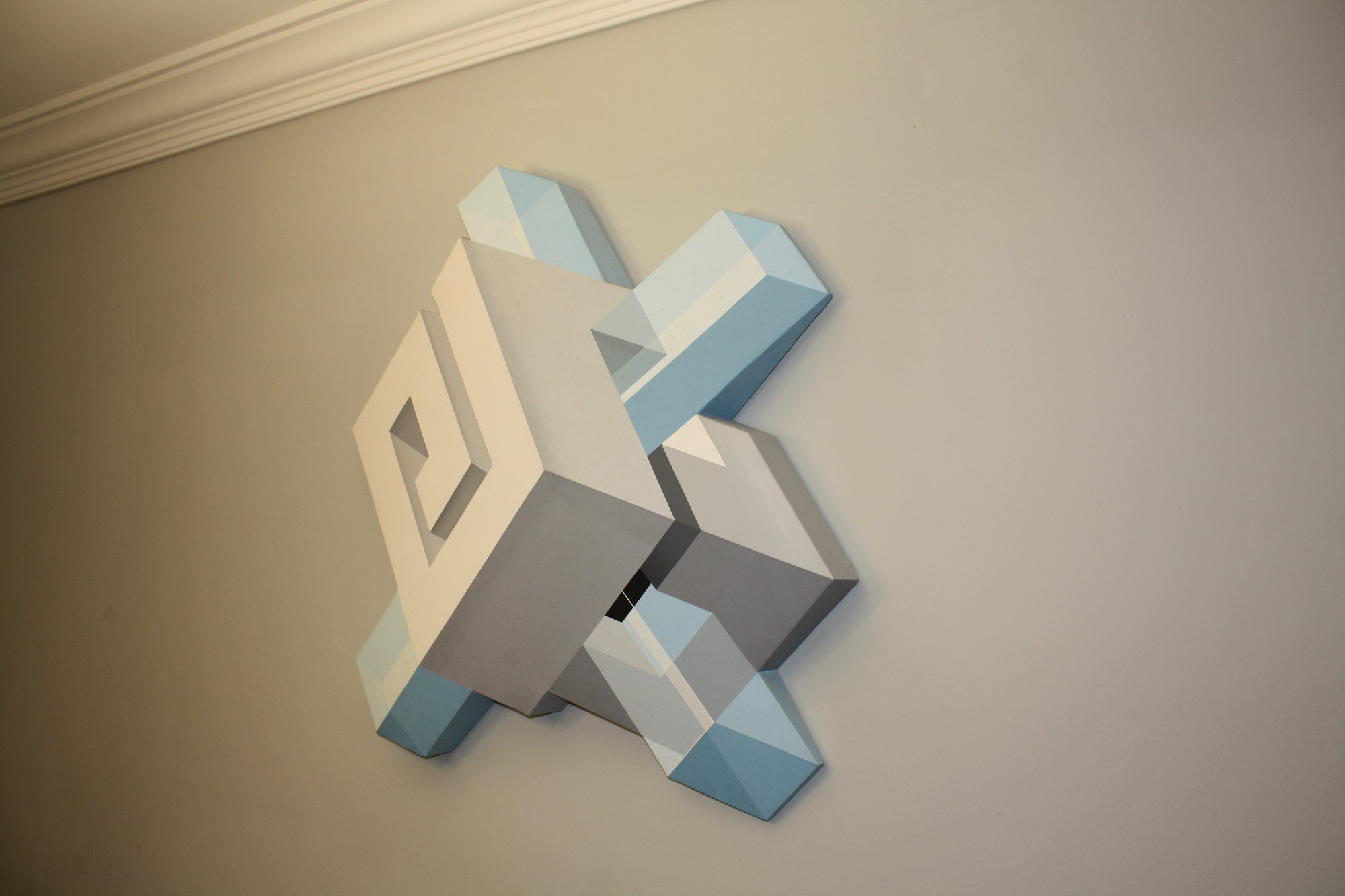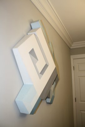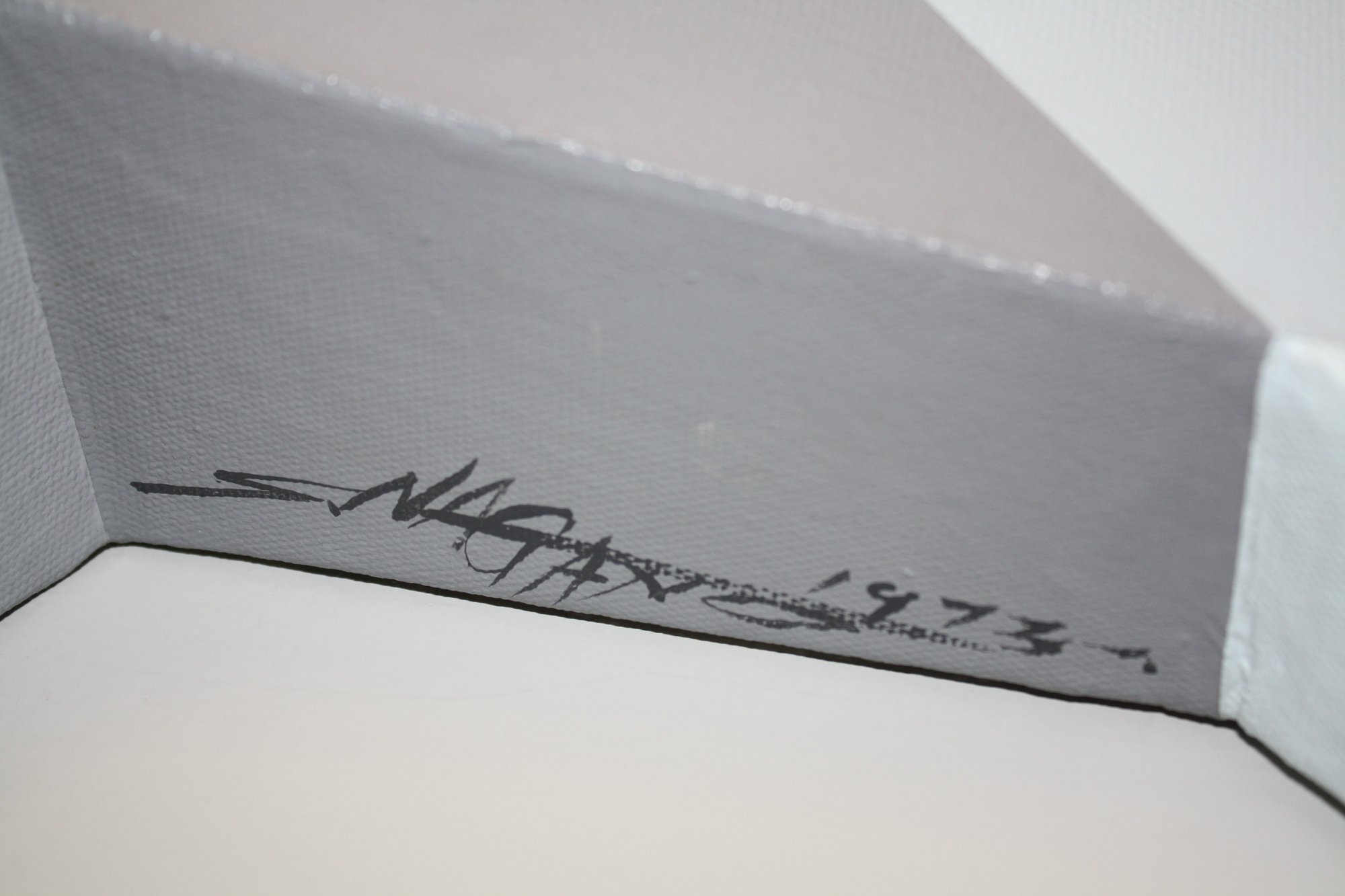 Shozo Nagano original 3-D painting on canvas optical art 1973The piece measures 31 inches long by 31 inches high and is designed to mount on a wall, showcasing geometric paradoxical forms and contemporary optical art aesthetics.