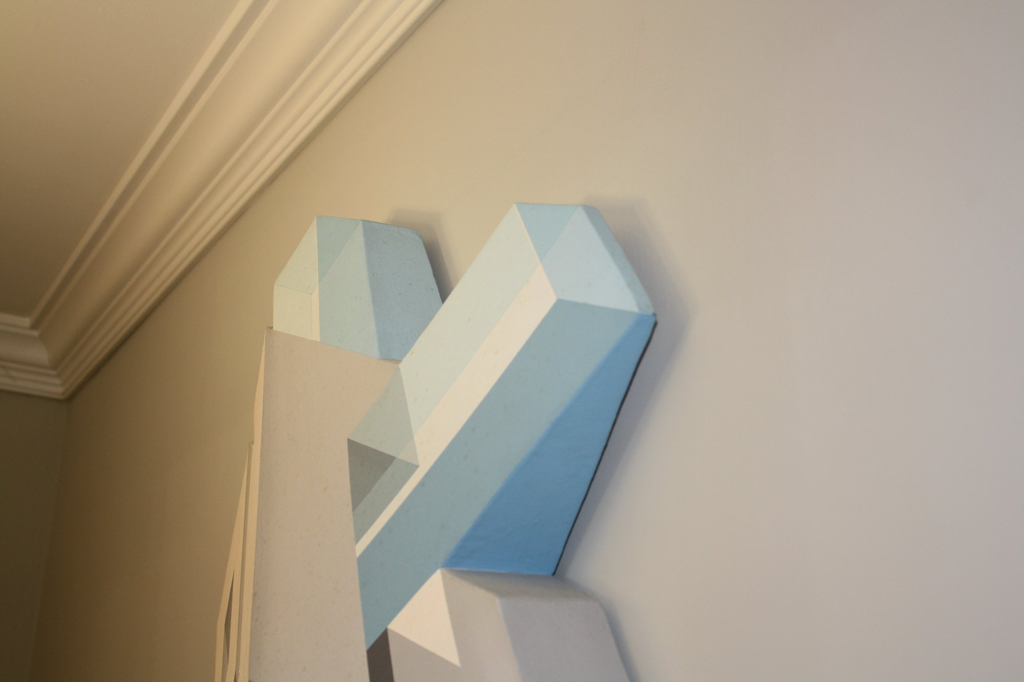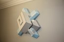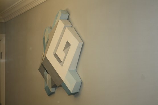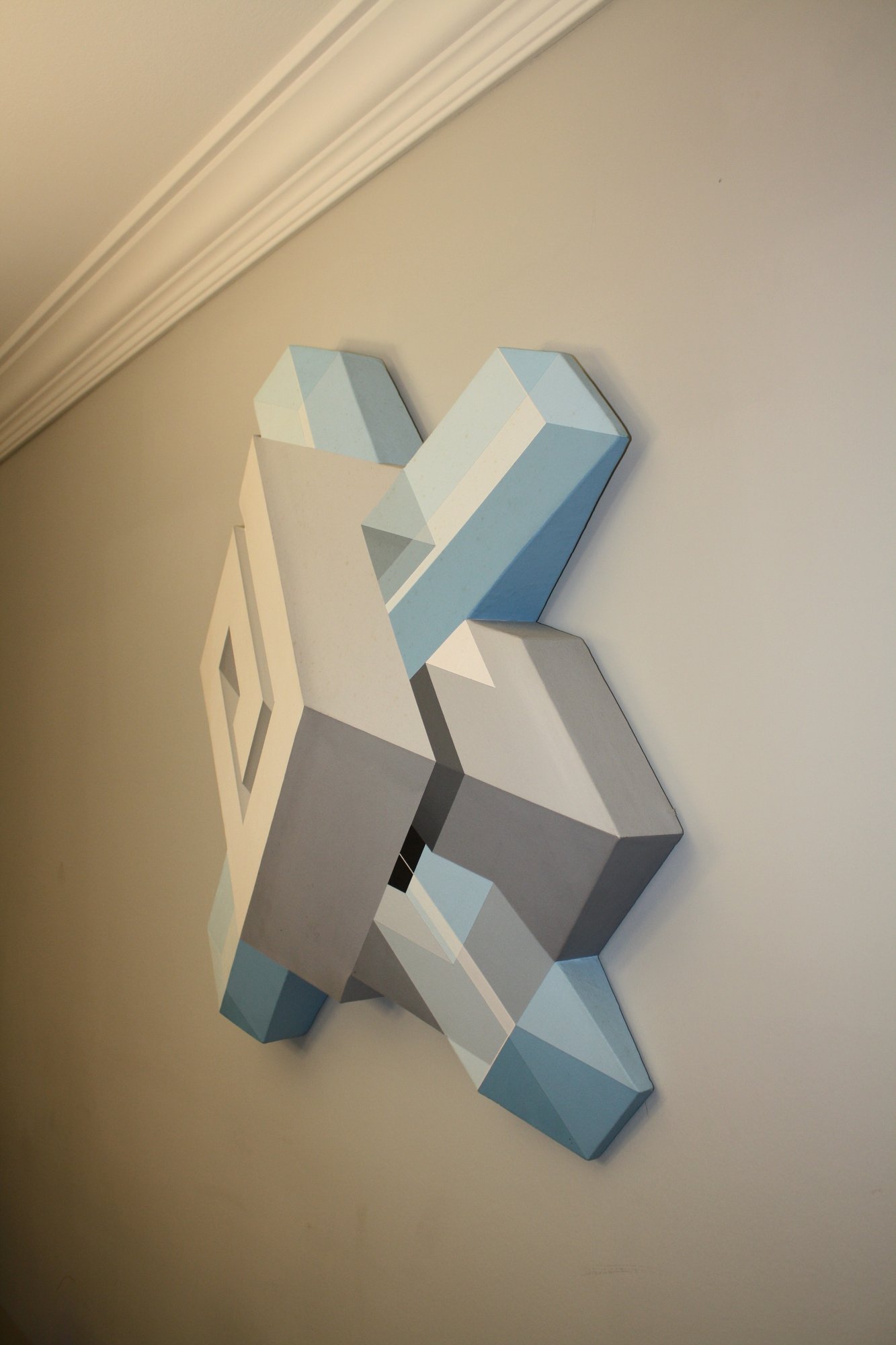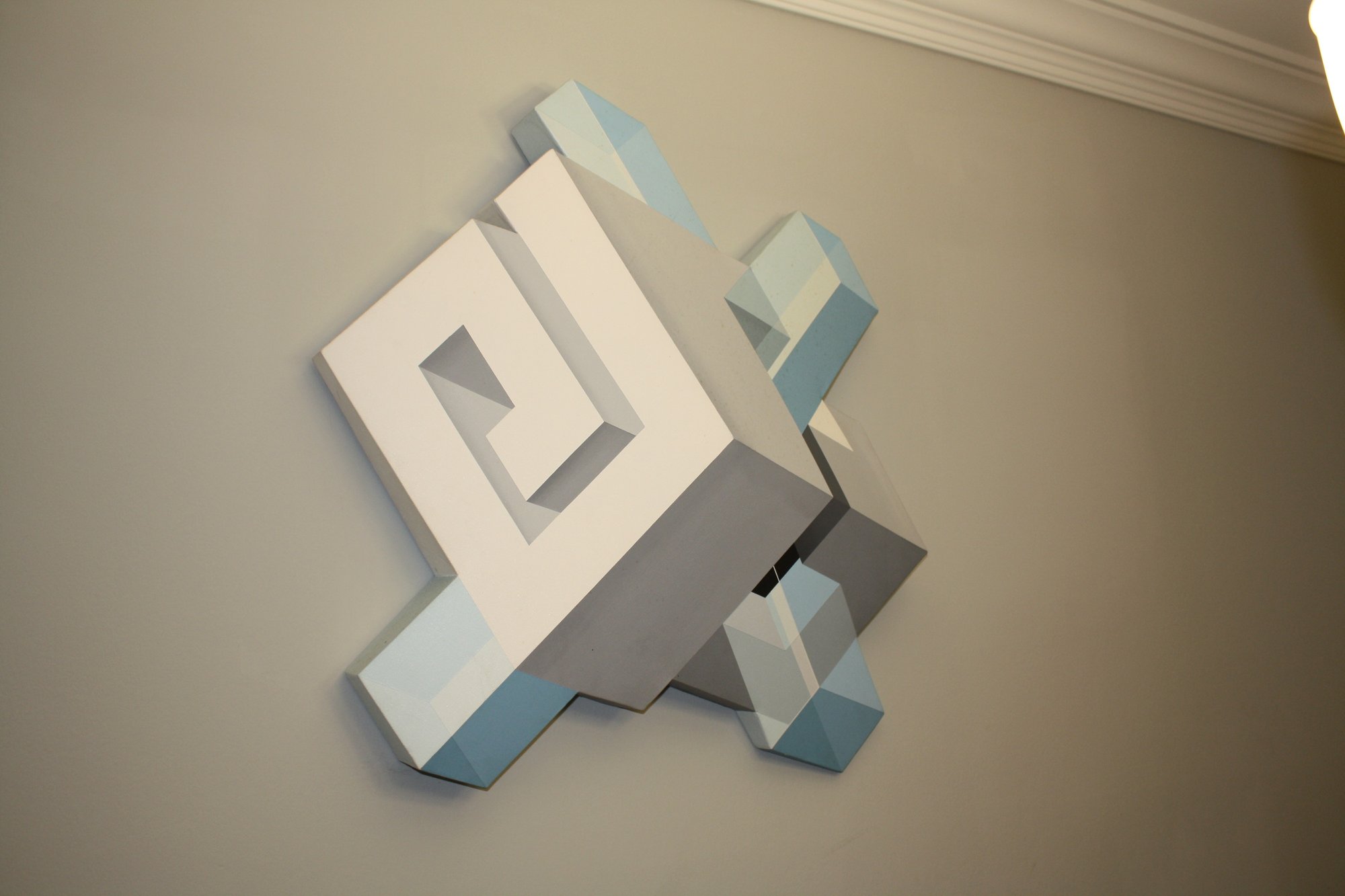 Shozo Nagano original 3-D painting on canvas optical art 1973The piece measures 31 inches long by 31 inches high and is designed to mount on a wall, showcasing geometric paradoxical forms and contemporary optical art aesthetics.
