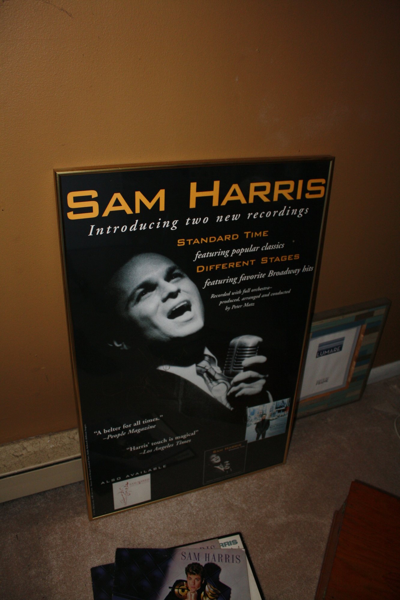 This framed promotional poster features vocalist Sam Harris and highlights two albums: Standard Time, featuring popular classics, and Different Stages, featuring Broadway hits. The poster notes production by Peter Matz and includes positive reviews from People Magazine and the Los Angeles Times. Measuring approximately 21 inches wide by 35 inches tall, it is a collectible piece of music memorabilia.