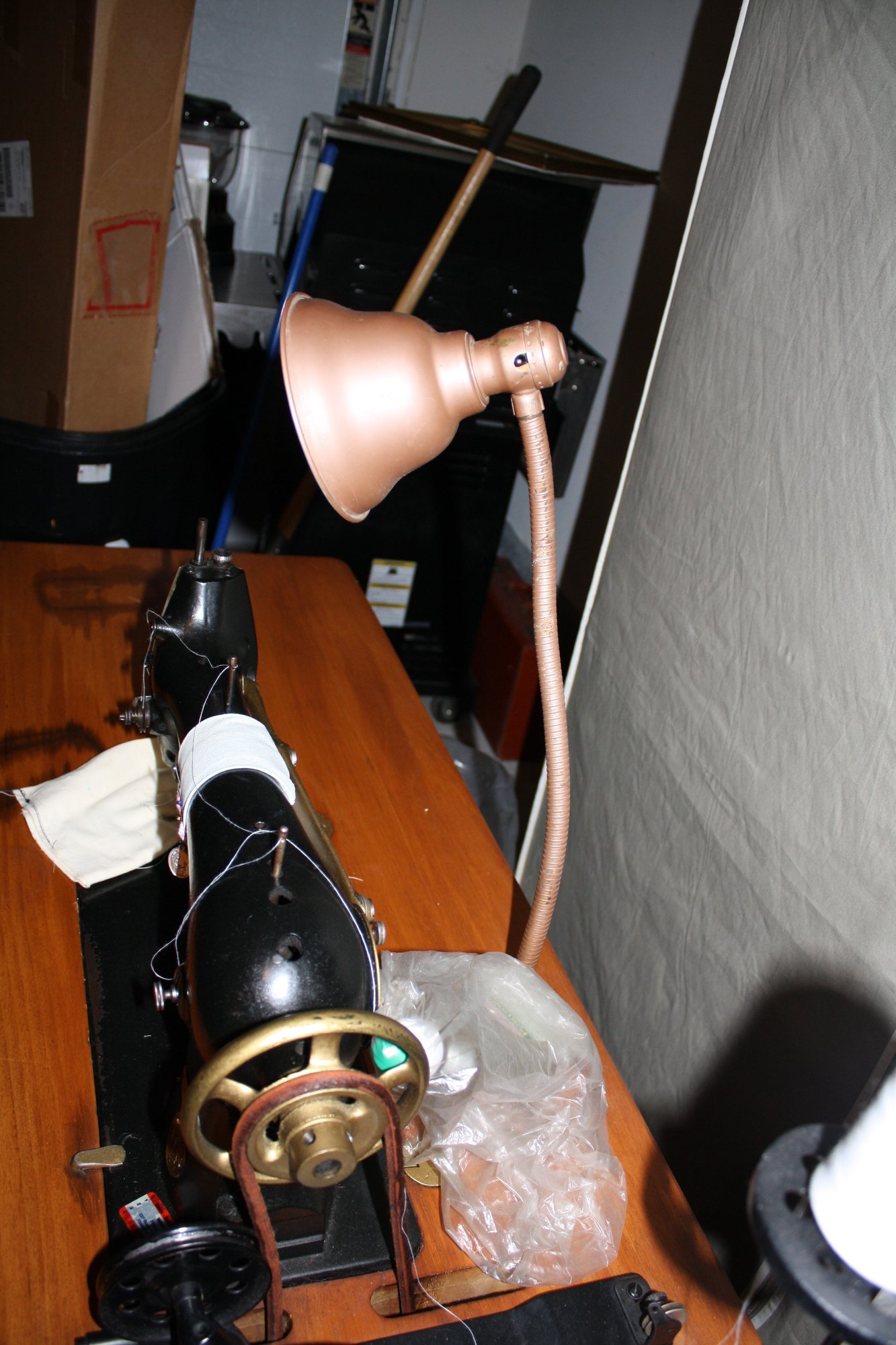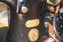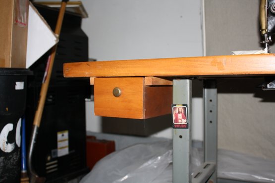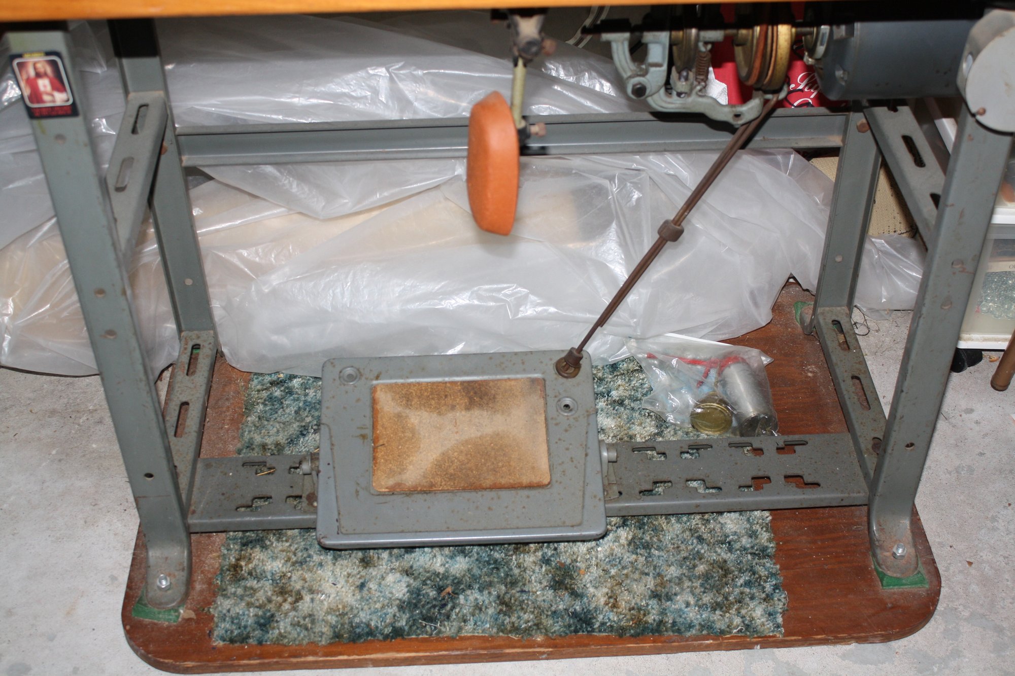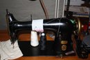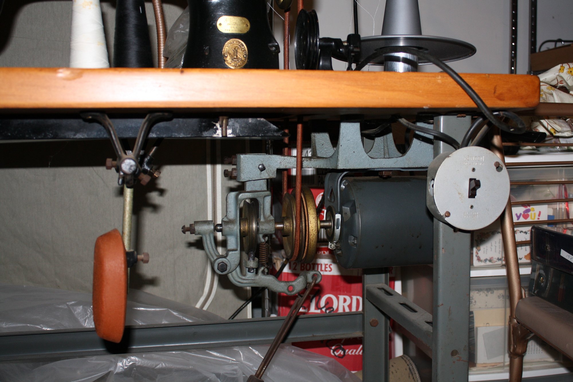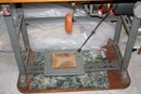 Singer industrial lockstitch sewing machine mounted on a heavy-duty work table measuring 49" x 19" with a height of 31", powered by an attached electric motor and belt-driven mechanism for high-speed straight stitching. Features a cast metal machine head, foot pedal control, integrated industrial steel stand, and spacious tabletop surface providing stable support and consistent mechanical performance characteristic of classic Singer industrial models.