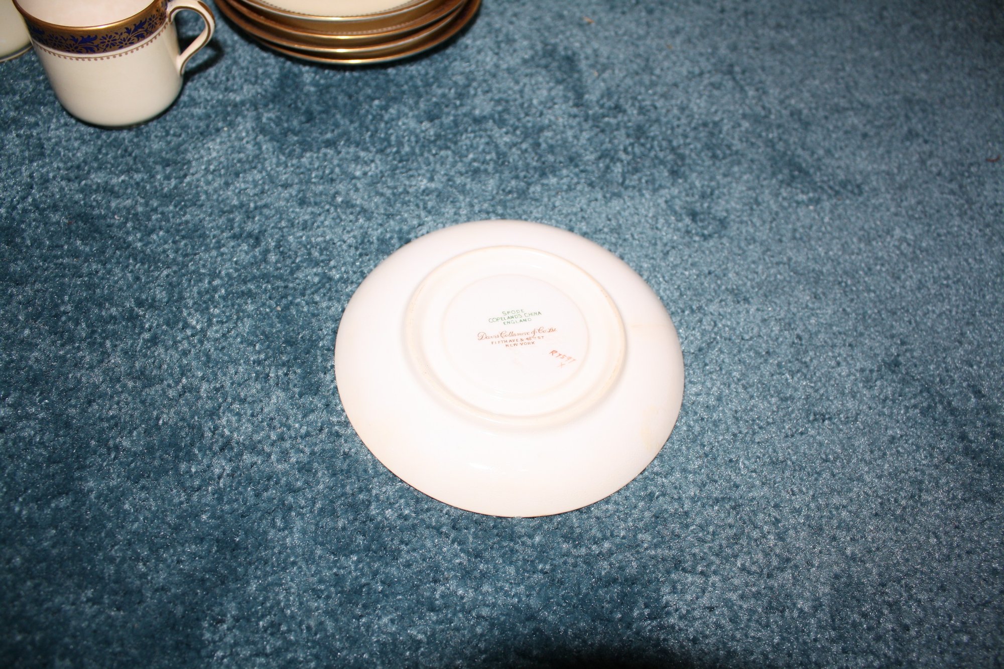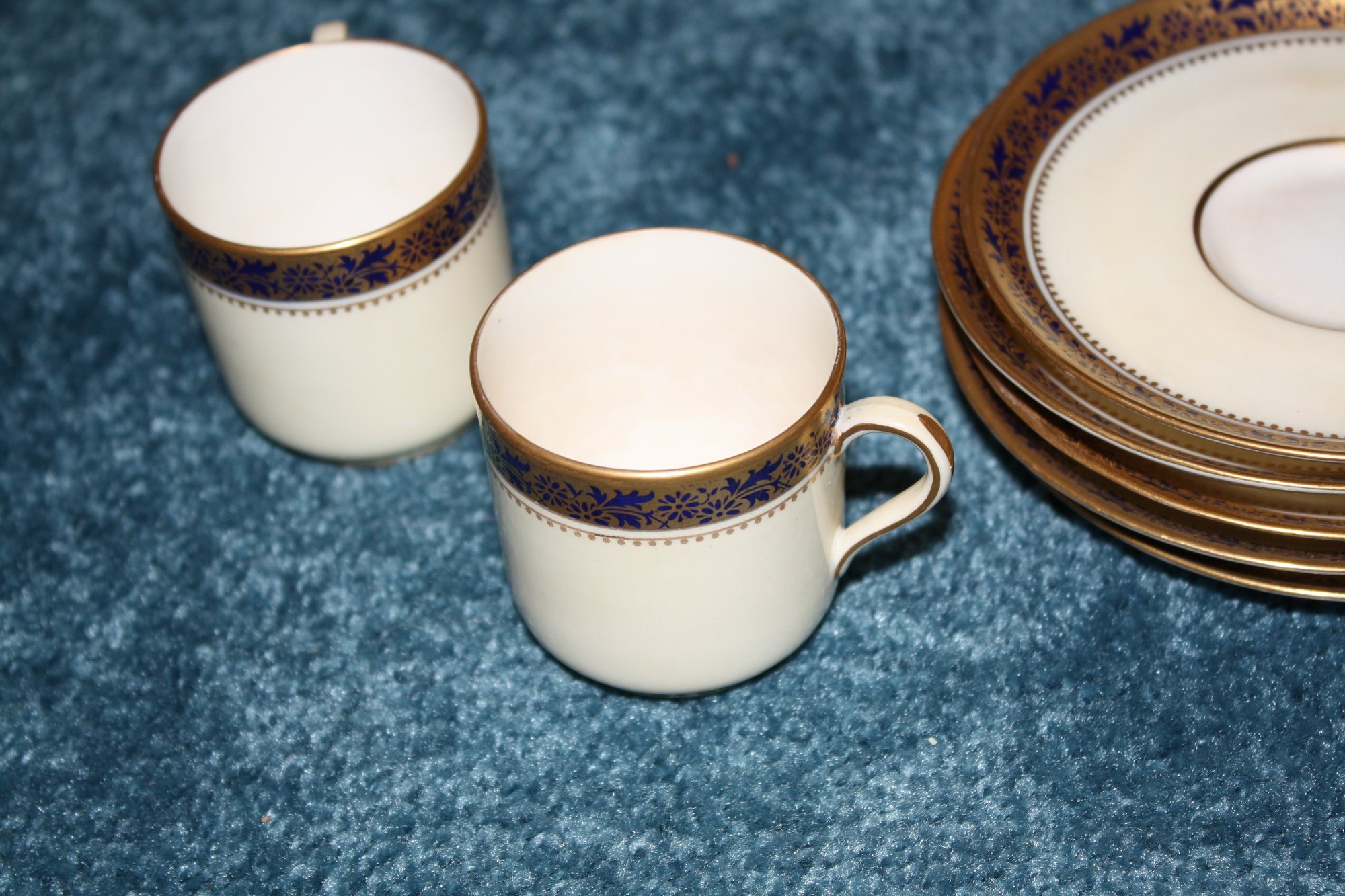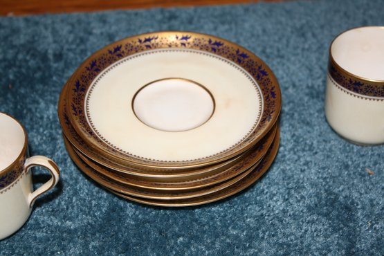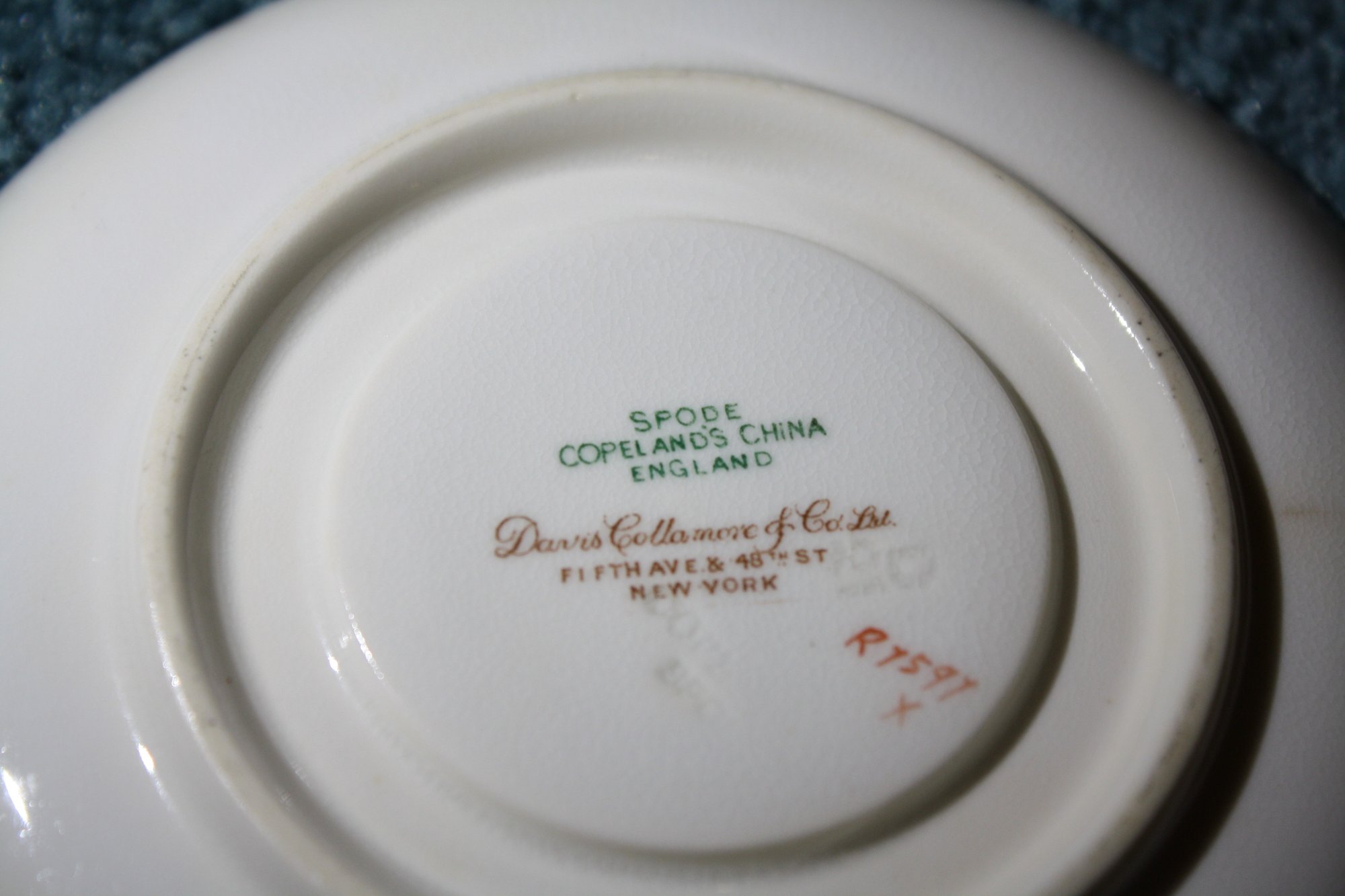 This collectible Spode Copeland bone china set includes teacups and matching saucers featuring cobalt blue and gold decorative trim. Pattern R7597, retailed by Davis Collamore & Co. in New York, showcases elegant gilded rims and is ideal for formal dining or display.