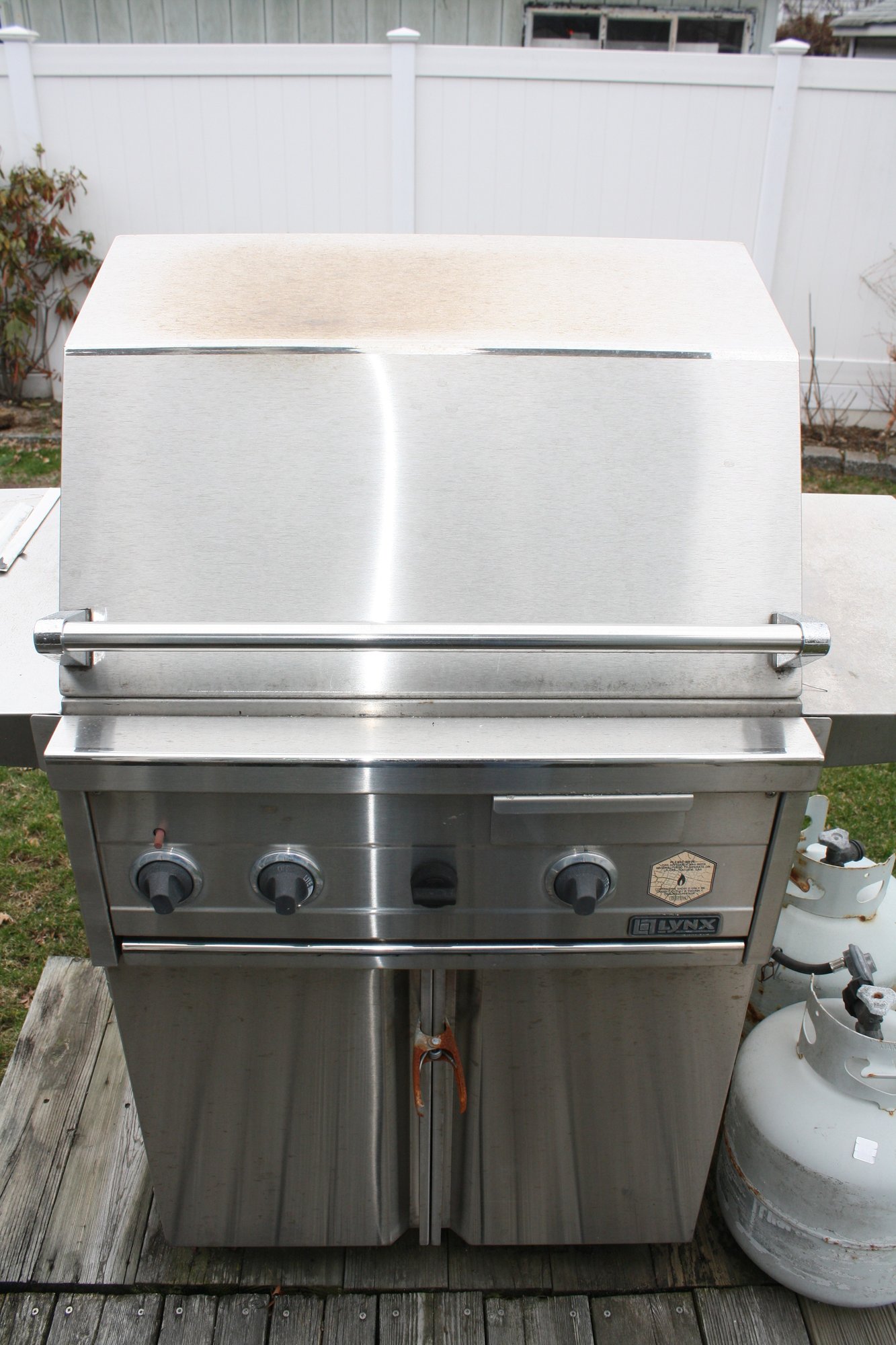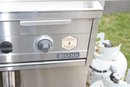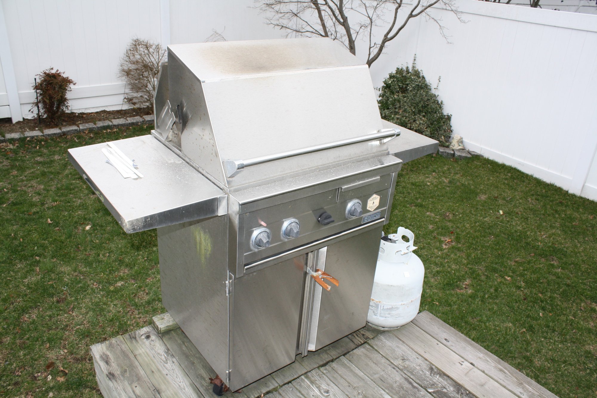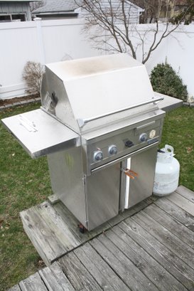 Freestanding outdoor gas grill constructed from durable stainless steel for long-lasting outdoor use. Propane-powered unit designed for outdoor cooking with multiple burner configuration and integrated ignition system. Suitable for grilling, searing, and general barbecue cooking, with potential compatibility for accessories such as rotisserie kits depending on model. Includes propane tank setup for fuel operation.