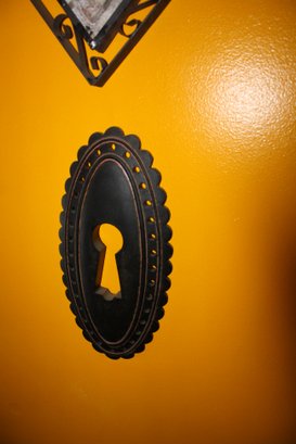 Decorative stamped brass keyhole cover in a vertical oval shape, designed as an escutcheon for furniture or doors. Adds a vintage or classic touch while protecting the keyhole edges and enhancing the overall aesthetic of cabinets, drawers, or doors.