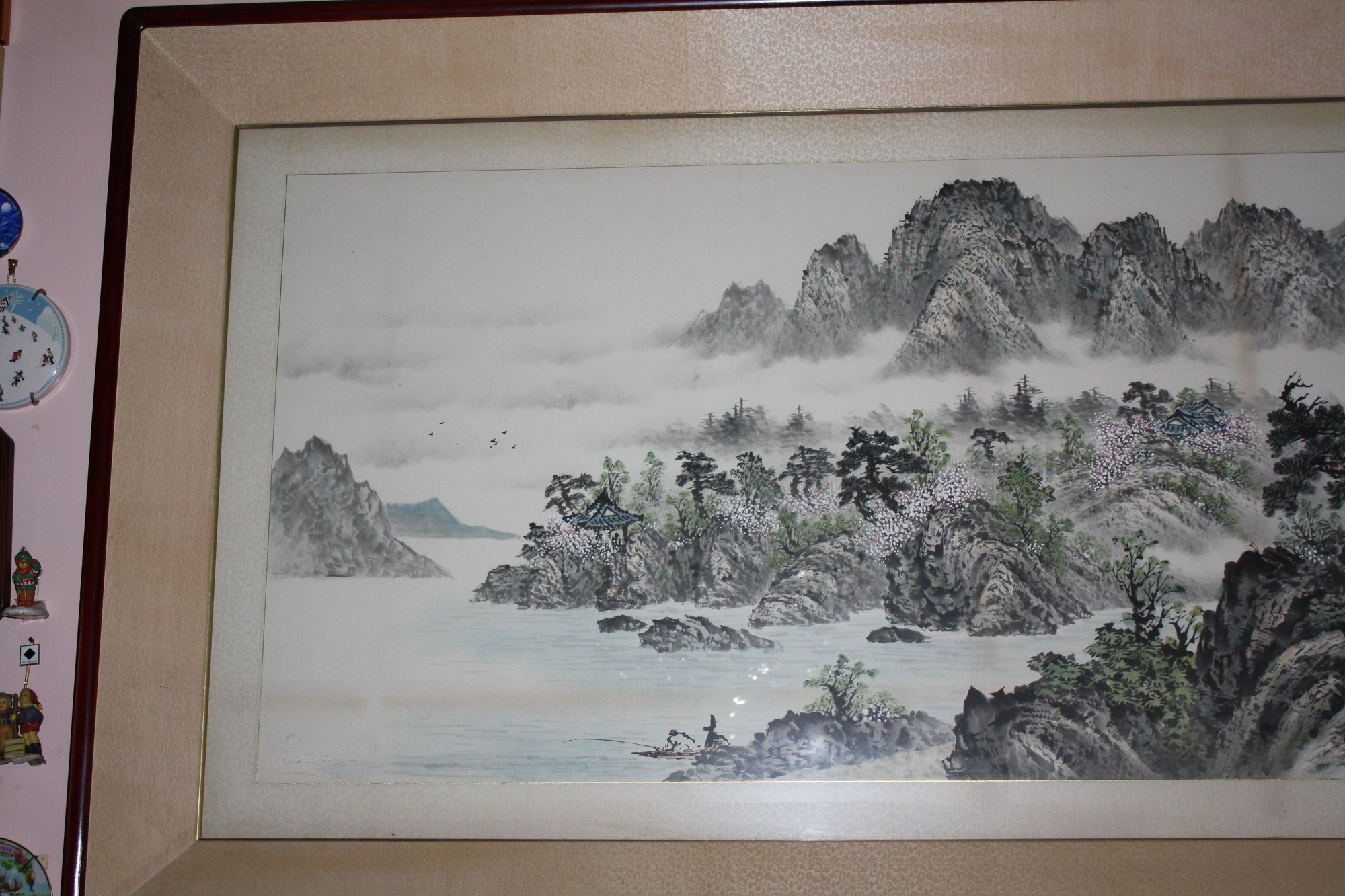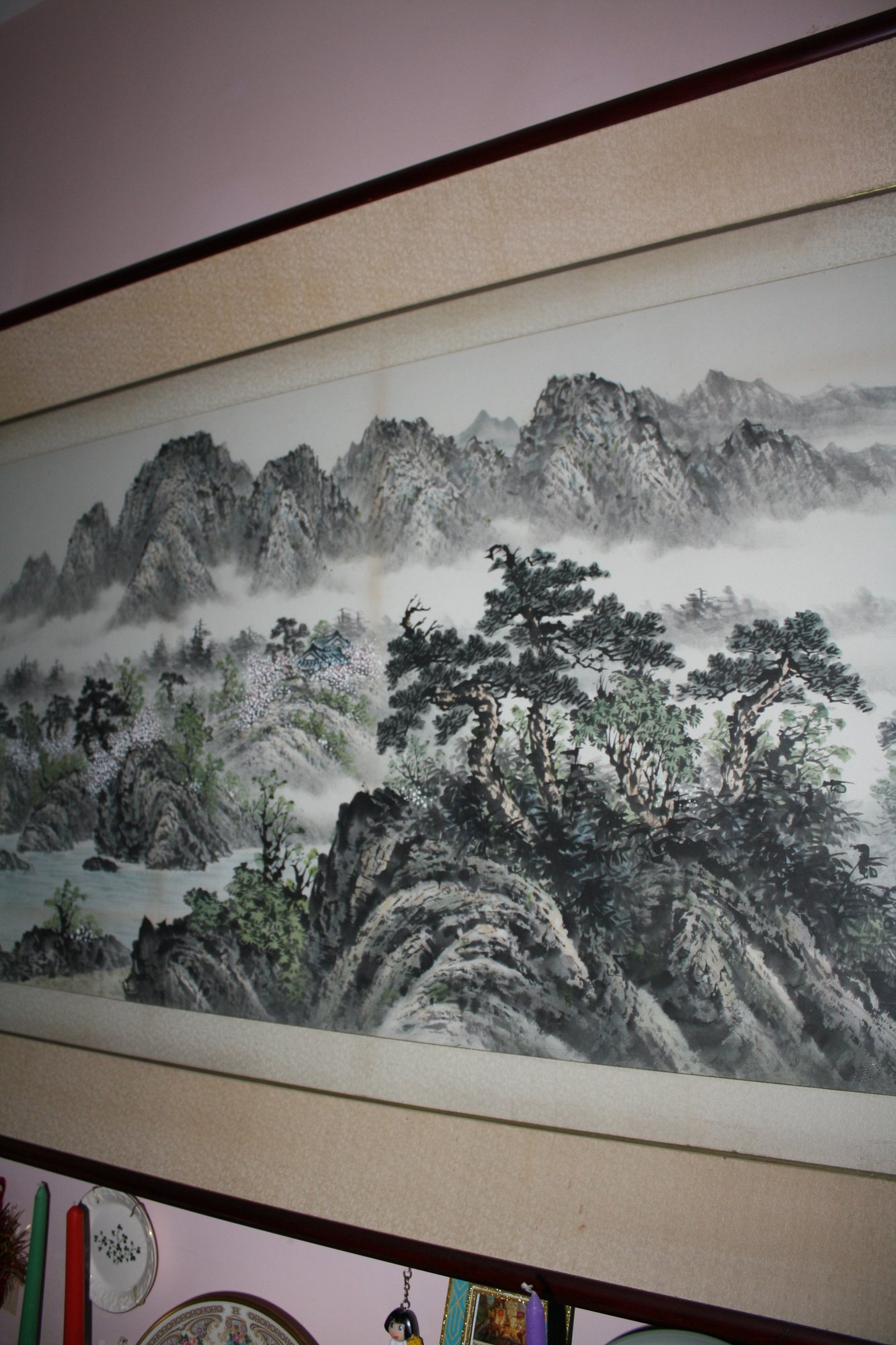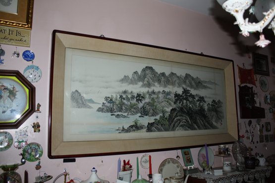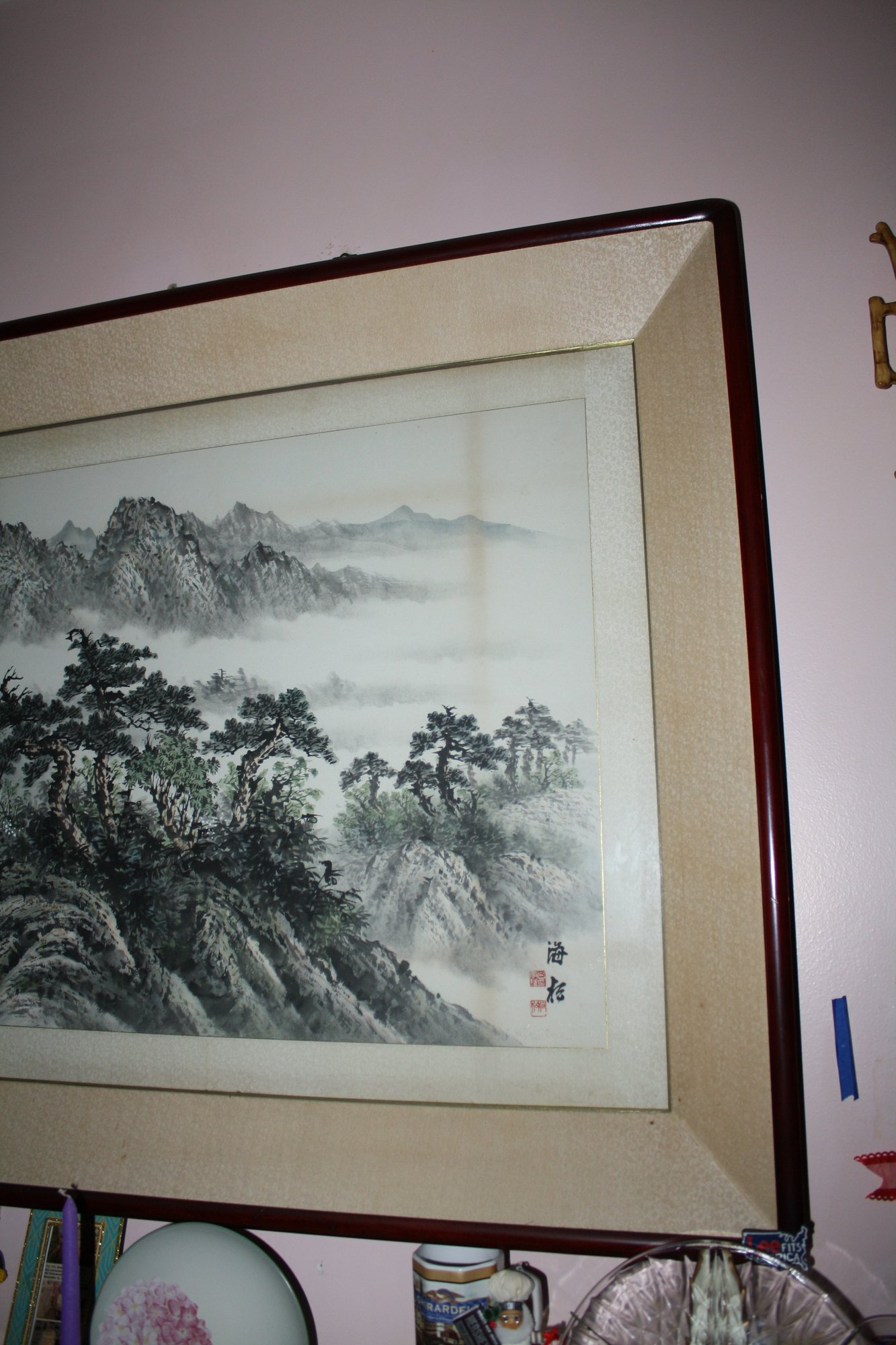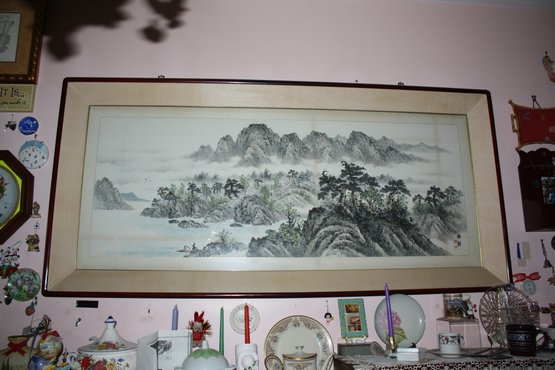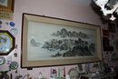 Stunning massive Framed Vintage Chinese Ink Wash Landscape Painting With Calligraphy VERY HEAVY YOU MUST BRING HELP The artwork measures approximately 35" tall, 75" wide, with a 3" depth.