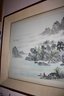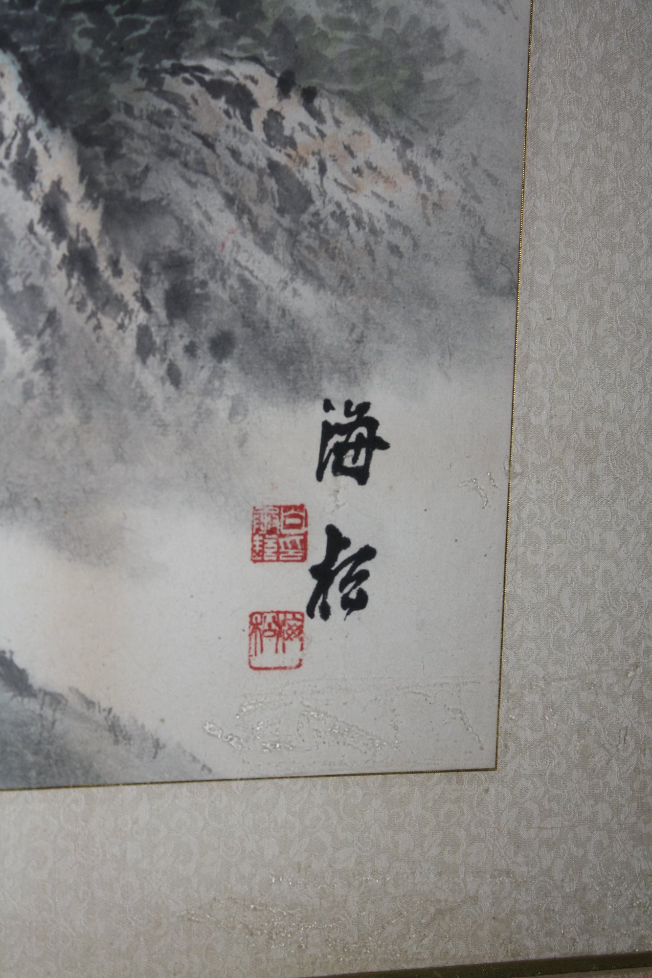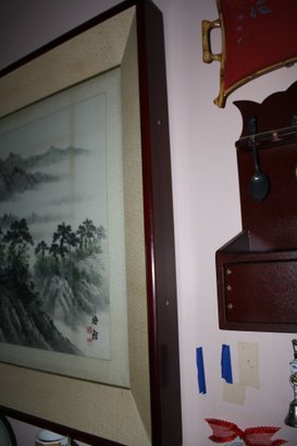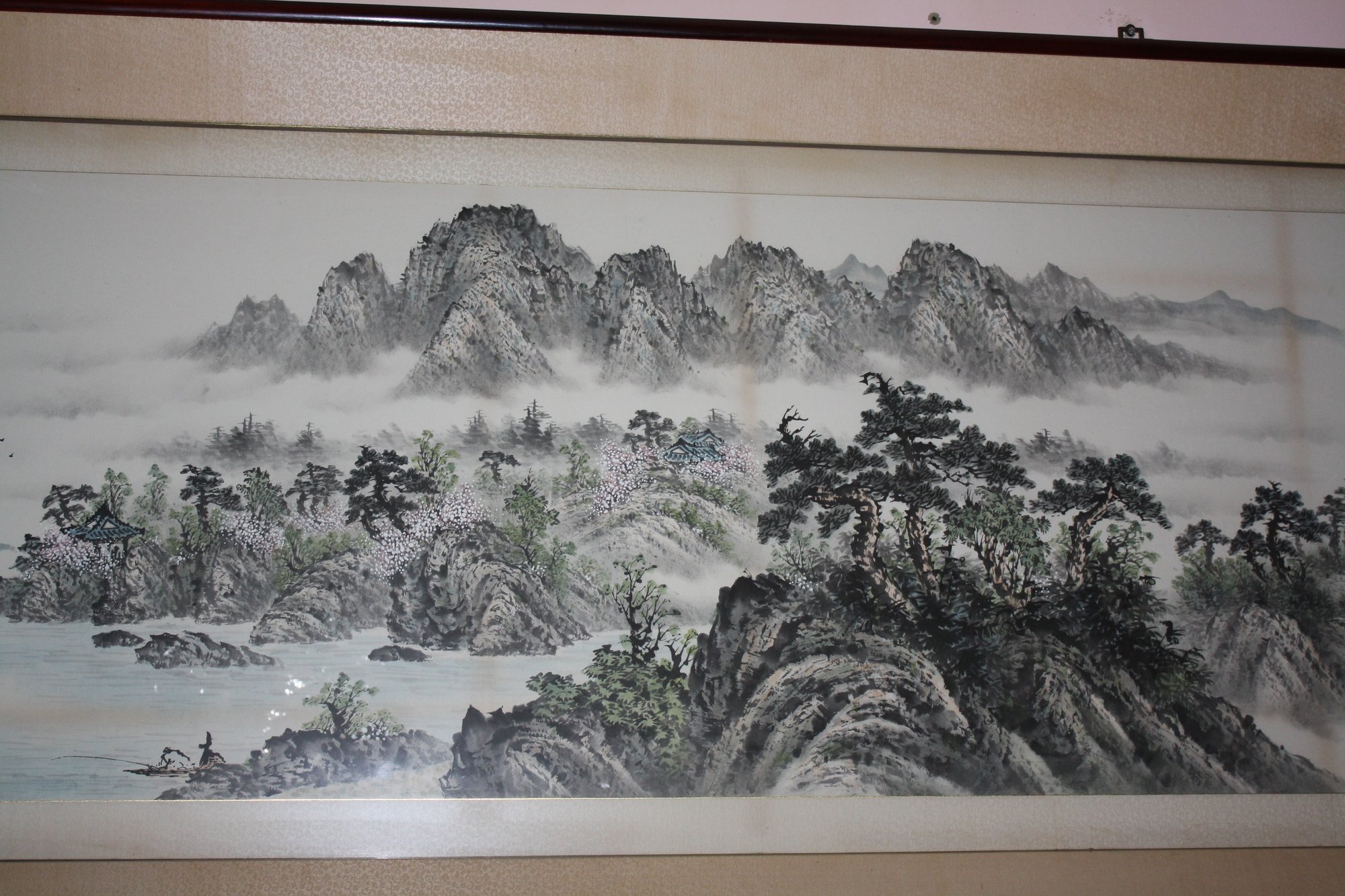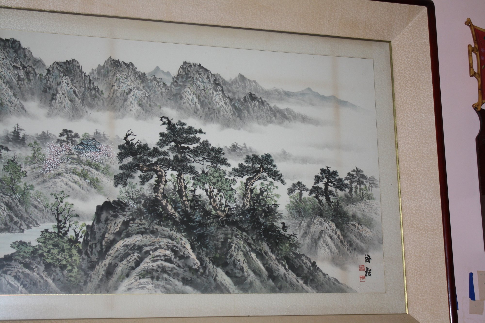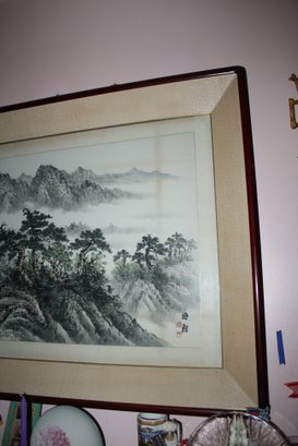 Stunning massive Framed Vintage Chinese Ink Wash Landscape Painting With Calligraphy VERY HEAVY YOU MUST BRING HELP The artwork measures approximately 35" tall, 75" wide, with a 3" depth.