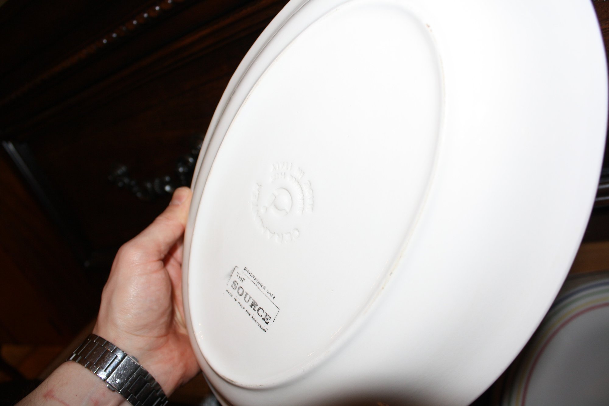 Italian porcelain oval platter featuring a bright multicolor striped band design arranged along the rim, displaying alternating red, green, yellow, and blue lines that frame the white porcelain center. The surface showcases a clean oval form with vibrant linear decoration that reflects a classic Mediterranean style ceramic pattern, and the underside bears a “The Source” marking.