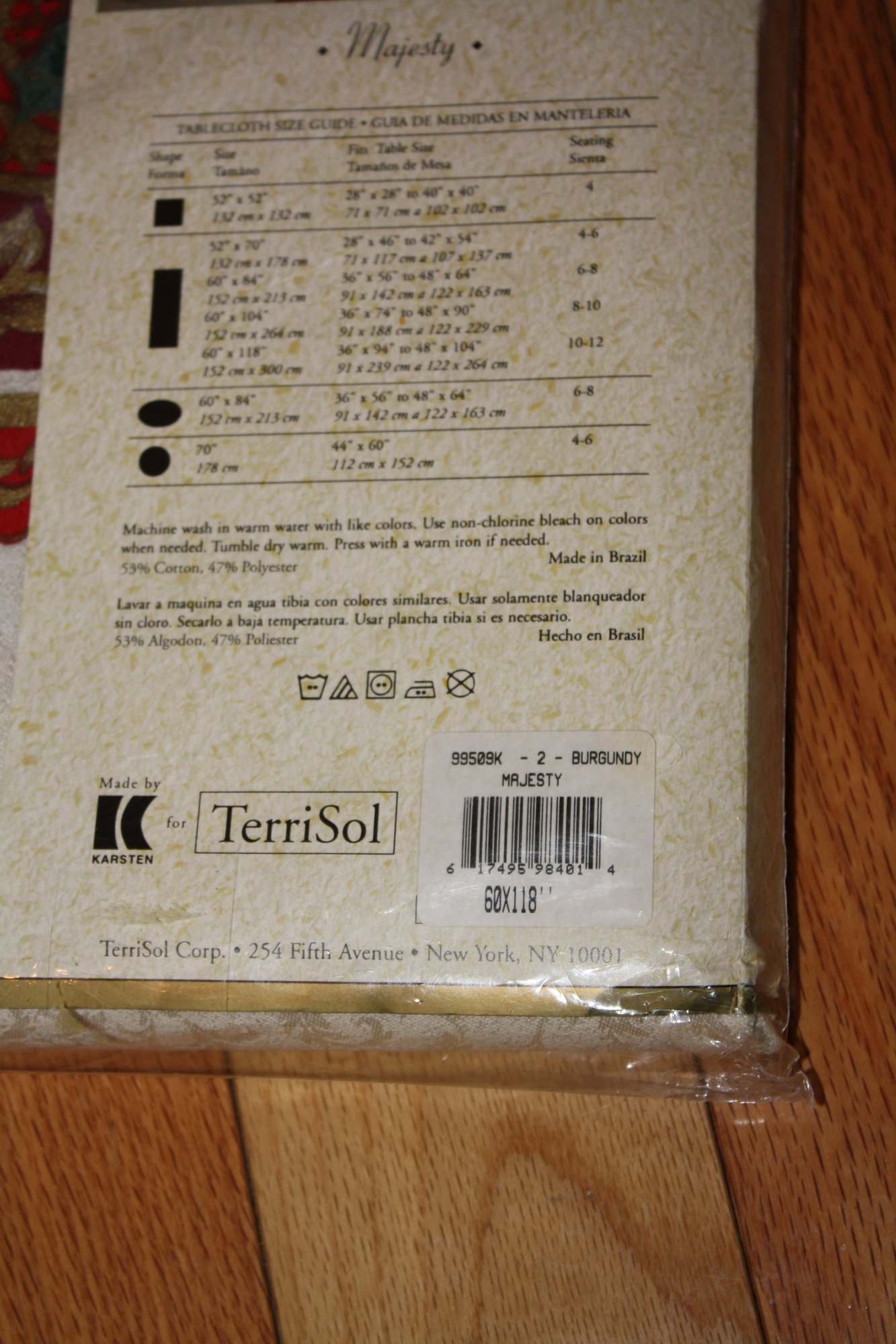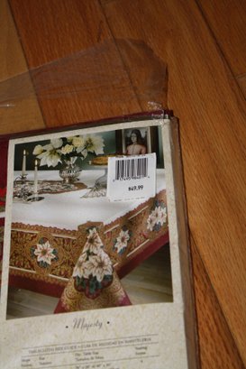 TerriSol Majesty collection tablecloth measuring approximately 60 by 118 inches and featuring a burgundy ground decorated with an ornate poinsettia floral pattern. The textile is crafted from a cotton and polyester blend fabric and displays a detailed botanical design with stylized poinsettia blossoms and foliage arranged across the surface in a repeating decorative motif.