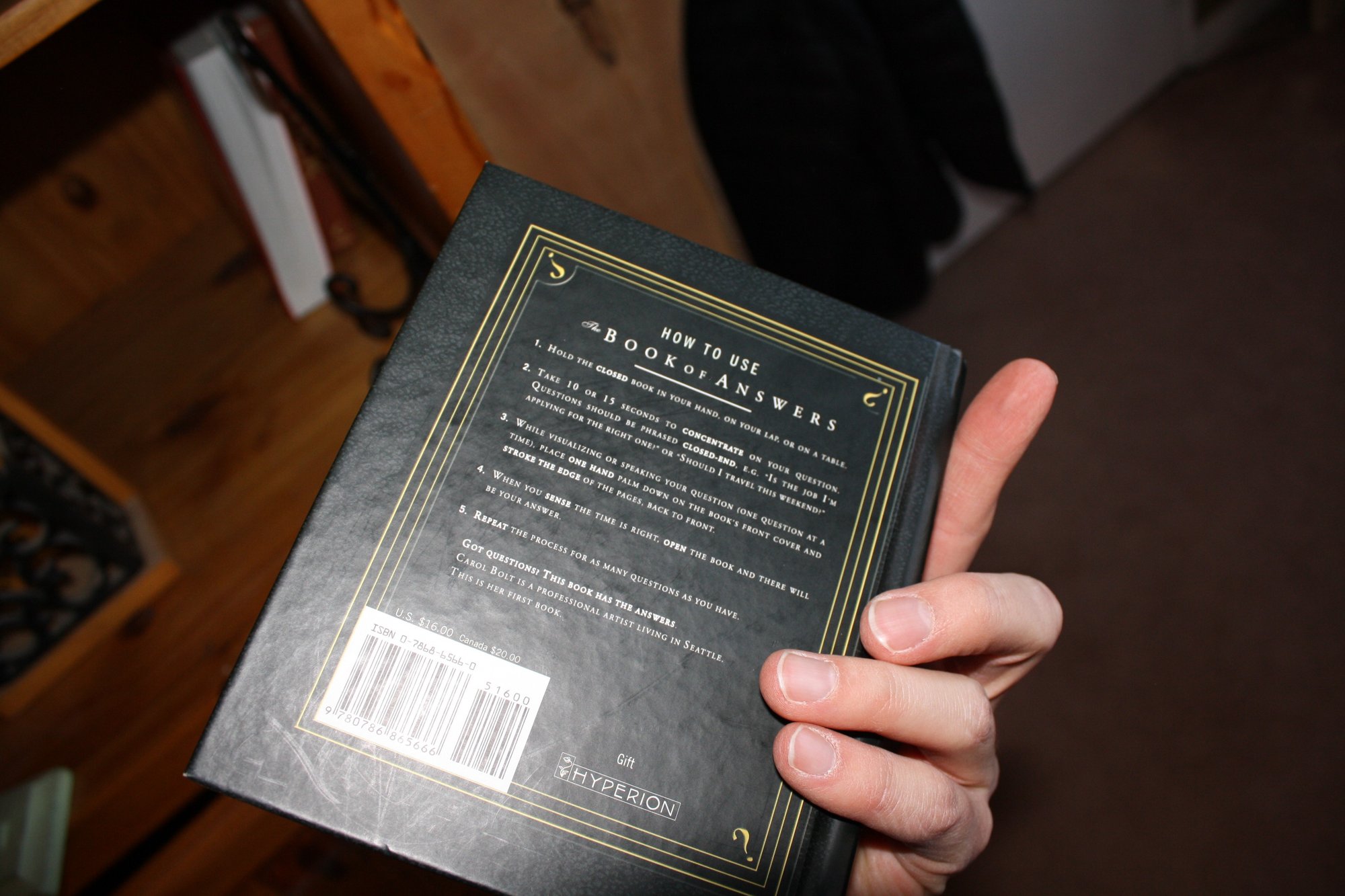 Interactive novelty book The Book of Answers by Carol Bolt. Users focus on a “yes” or “no” question and open the book to a random page to receive an answer. Hardcover design with a simple classic cover; functions like a “magic 8-ball” in book form. Non-electronic and entertaining, ideal for parties, gifts, or personal guidance fun.