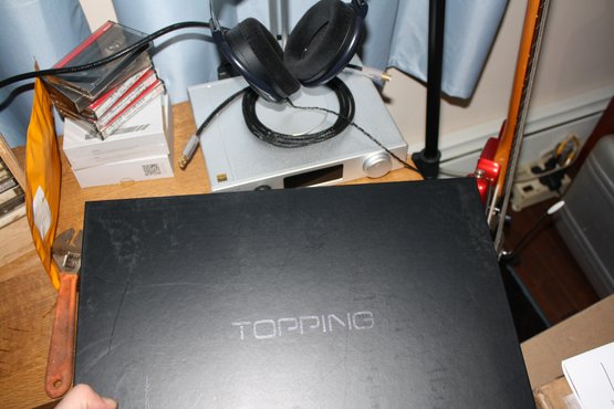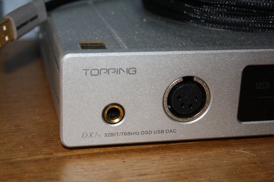 Topping DX7s balanced digital-to-analog converter and headphone amplifier housed in a compact silver aluminum chassis with digital display. Supports high-resolution audio decoding up to 32-bit/768kHz PCM and native DSD512 via USB input for computer-based playback. Features both unbalanced headphone output and 4-pin XLR balanced output, making it suitable for a wide range of high-fidelity headphone listening setups. Designed for accurate, low-noise audio performance in desktop HiFi systems.