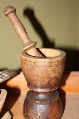 Traditional wooden mortar and pestle set, carved from durable hardwood such as acacia or walnut. Designed for crushing and grinding spices, herbs, garlic, and ginger. Features hand-turned decorative details and shows natural signs of age, consistent with vintage wooden tools. Commonly used in the Philippines as a “lusong” for preparing dishes like nilupak. Requires occasional food-grade oiling to maintain the wood.