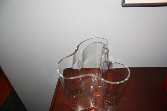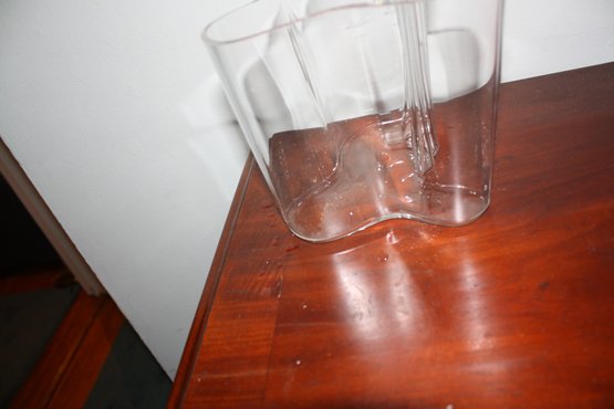 Iconic Iittala Aalto Vase, also known as the Savoy Vase, designed by Alvar Aalto in 1936, featuring the signature organic and asymmetrical wave-like silhouette inspired by Finnish lakes, mouth-blown at the Iittala glass factory in Finland and crafted from high-quality clear glass, with an approximately 8.5-inch opening at the mouth, representing a celebrated example of Scandinavian modern design.