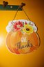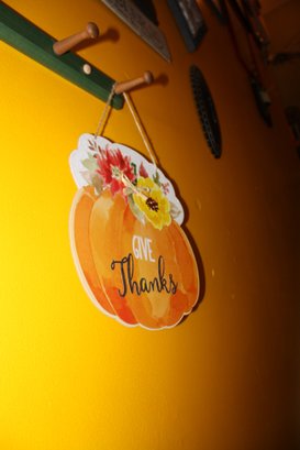 Seasonal wall decor featuring a watercolor-style pumpkin with red and yellow floral accents and the phrase “GIVE Thanks.” Constructed from printed paper on MDF wood and equipped with a twine hanger, this rustic piece measures approximately 10–12 inches wide and is perfect for indoor or covered outdoor display during fall and Thanksgiving celebrations.