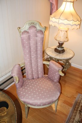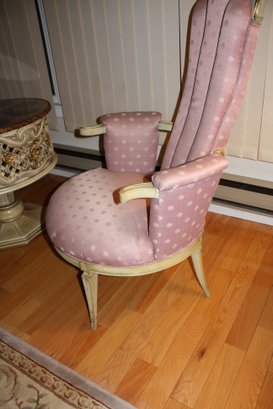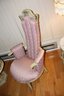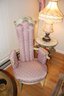 Victorian-Style Armchair With Ornate Wooden Frame And Pink Upholstery #1 measuring 28" wide including armrests, 22" deep, and 48" high,