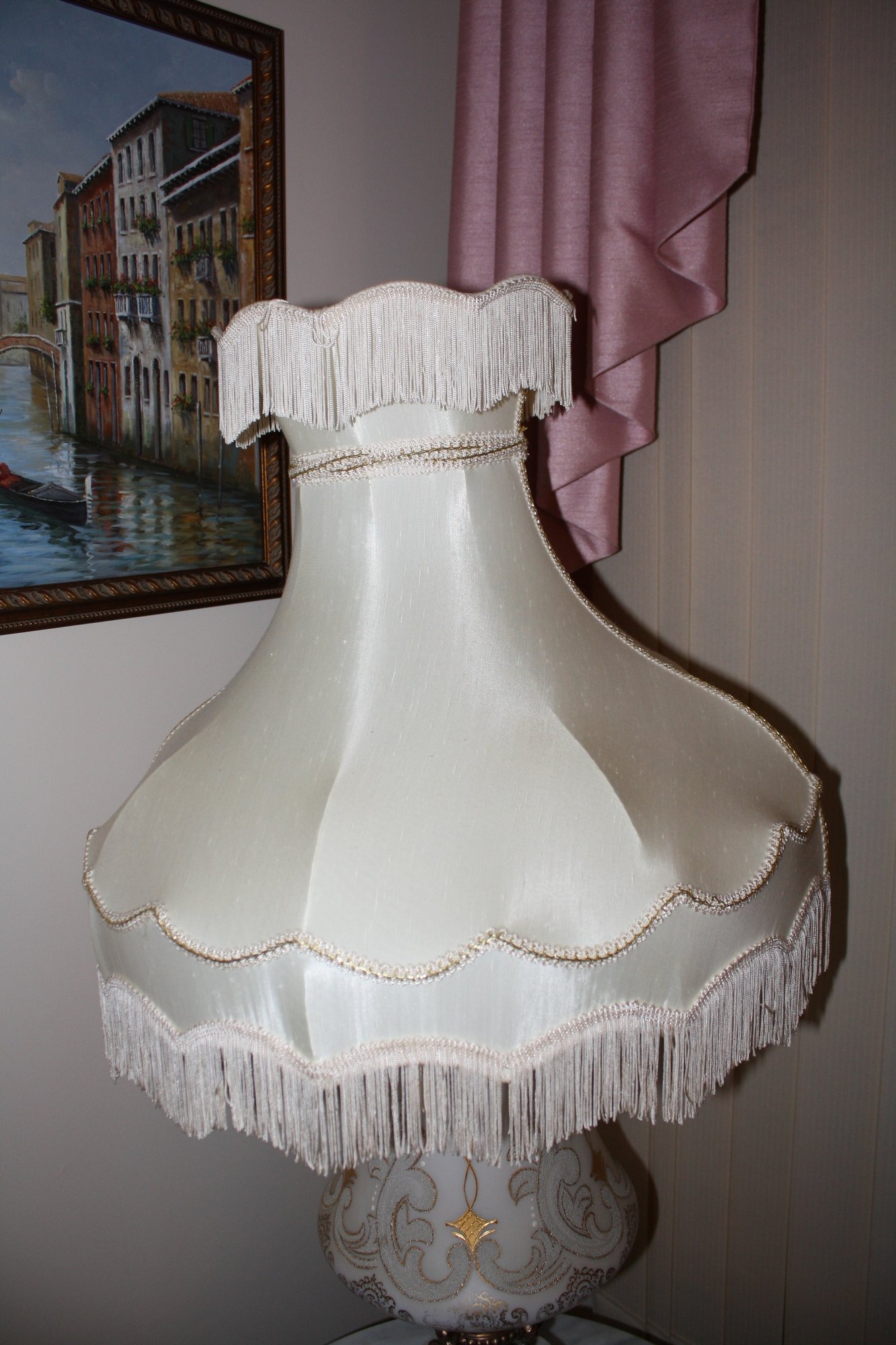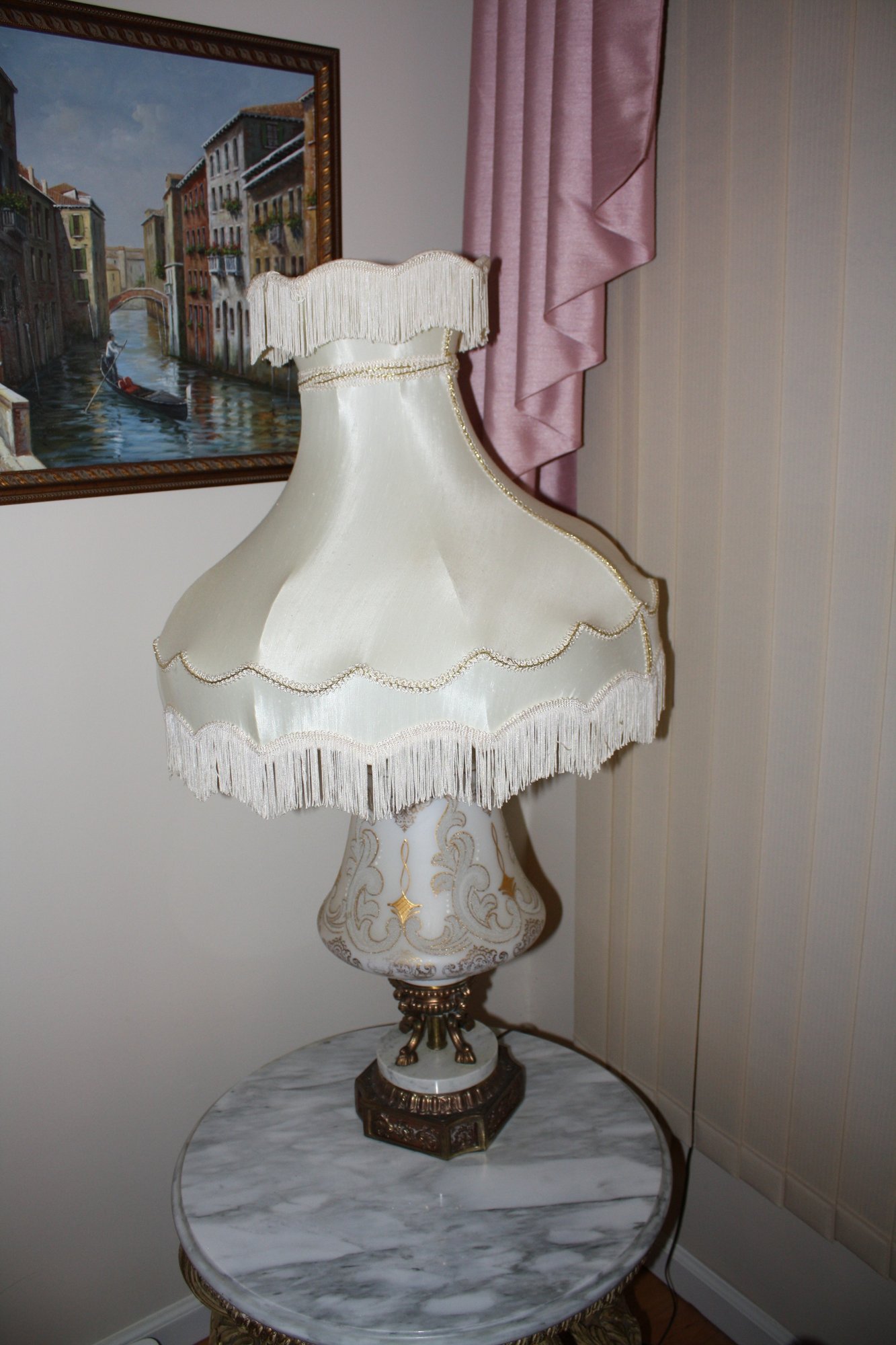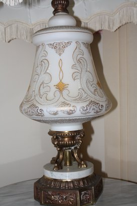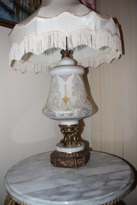 Vintage porcelain table lamp standing 39" high, featuring a Victorian-style fabric lampshade with decorative fringe and a porcelain base adorned with ornate gold-painted detailing. The lamp combines sculpted porcelain artistry with gilded accents and classic lamp proportions, creating an elegant tabletop lighting piece with refined decorative appeal.