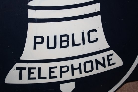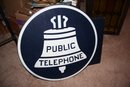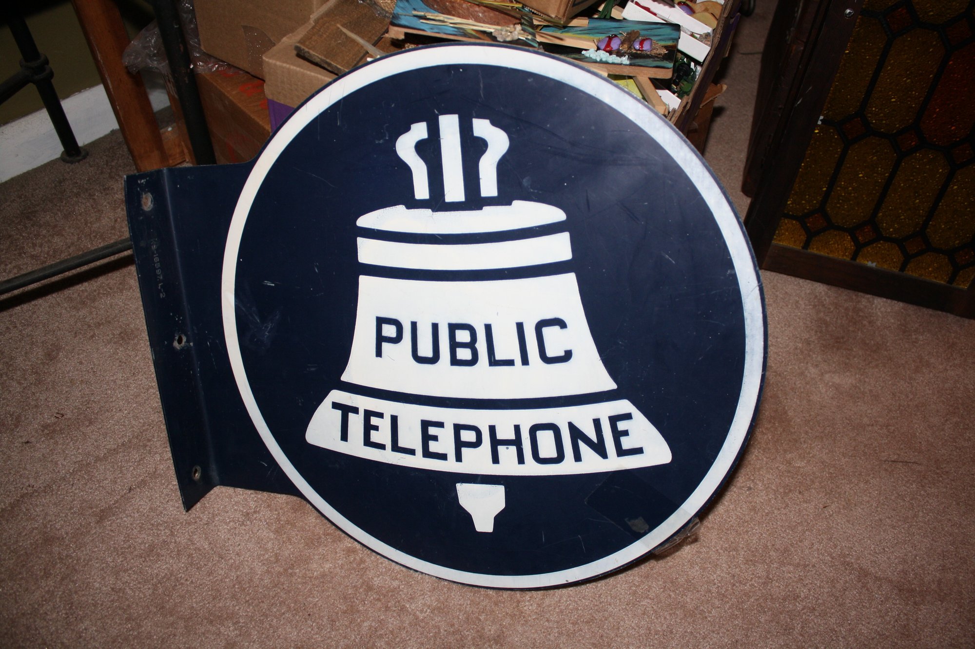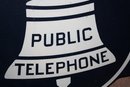 Vintage double-sided flange sign from the 1940s–1950s used to identify public telephones. Crafted from tin or painted aluminum, featuring a classic black and white design with a bell graphic associated with the Bell System. Ideal for collectors of vintage signage, telecommunication memorabilia, or mid-century advertising artifacts. 20" diameter