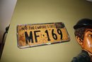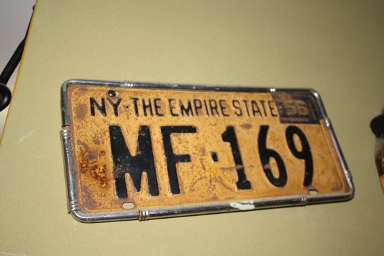 Authentic 1956 New York passenger vehicle license plate, plate number MF 169, featuring the “Empire State” slogan. Black lettering on a yellow background with a chrome-colored frame. Shows natural patina, rust, and wear consistent with its vintage age. Ideal for collectors, automotive décor, or historical displays.