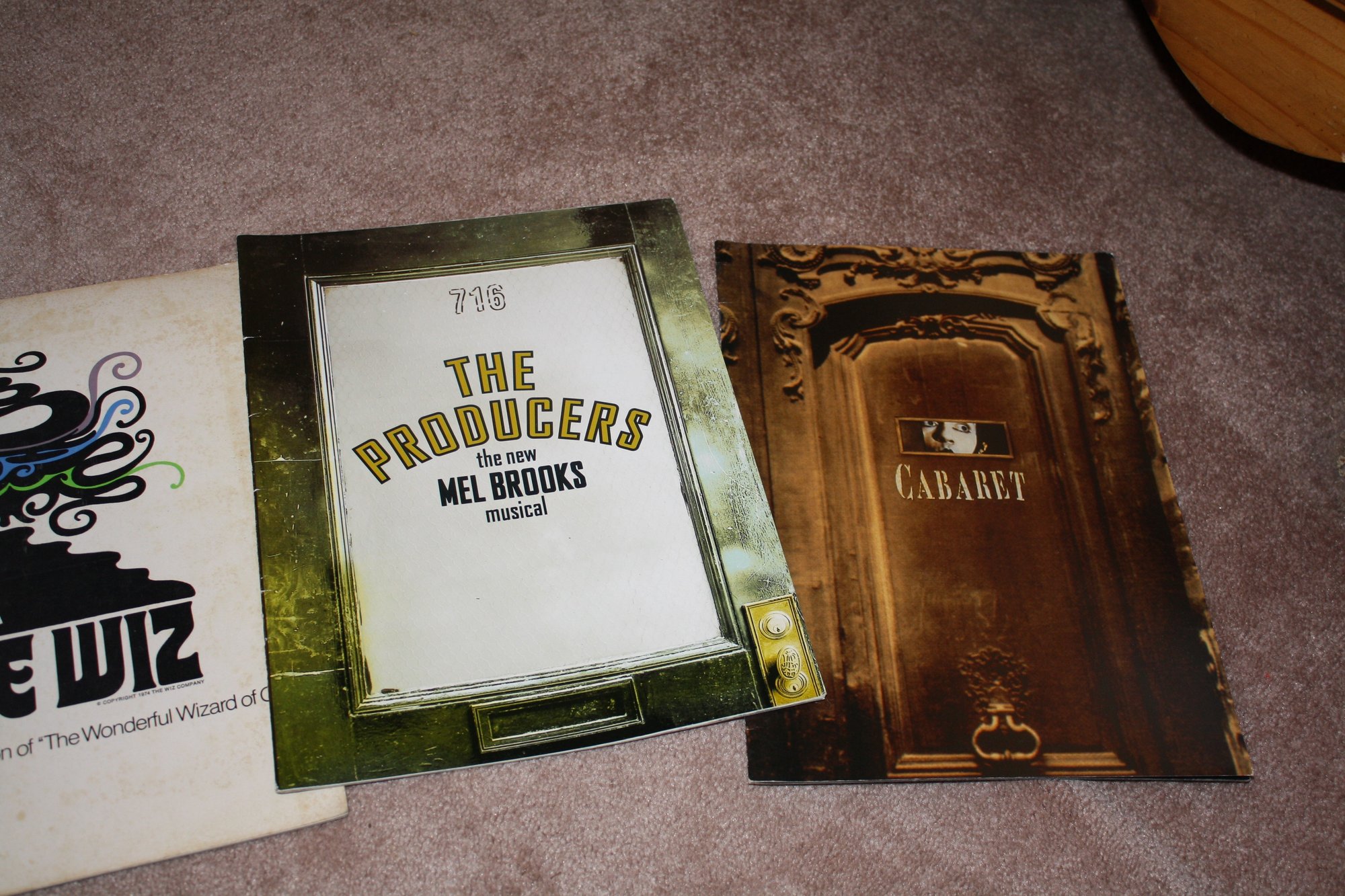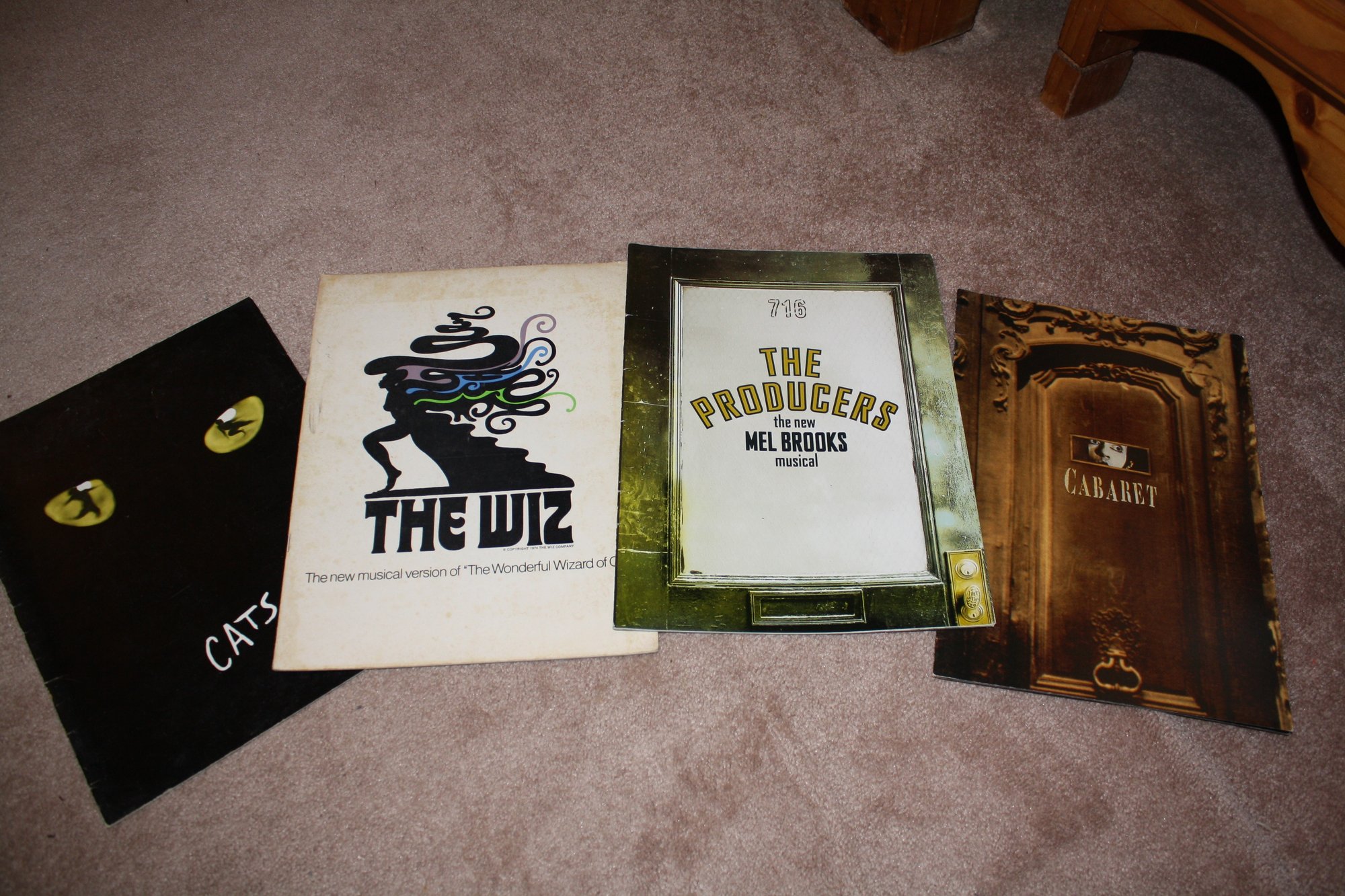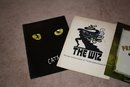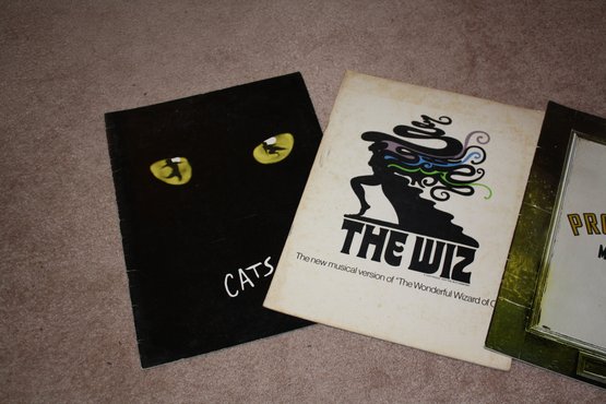 A collection of vintage theater programs featuring iconic musicals including Cats, The Wiz, The Producers, and Cabaret, showcasing original poster art, production details, and cast listings, with glossy covers and illustrated pages highlighting the design and branding of each Broadway show.