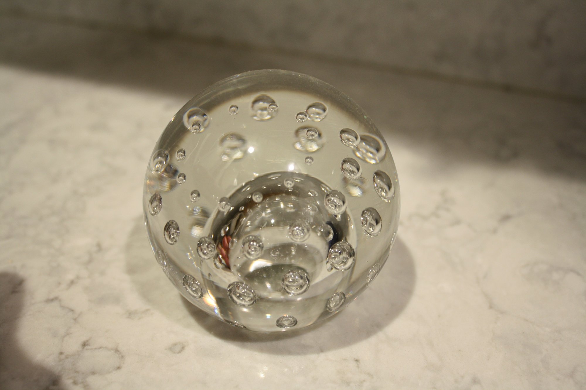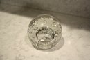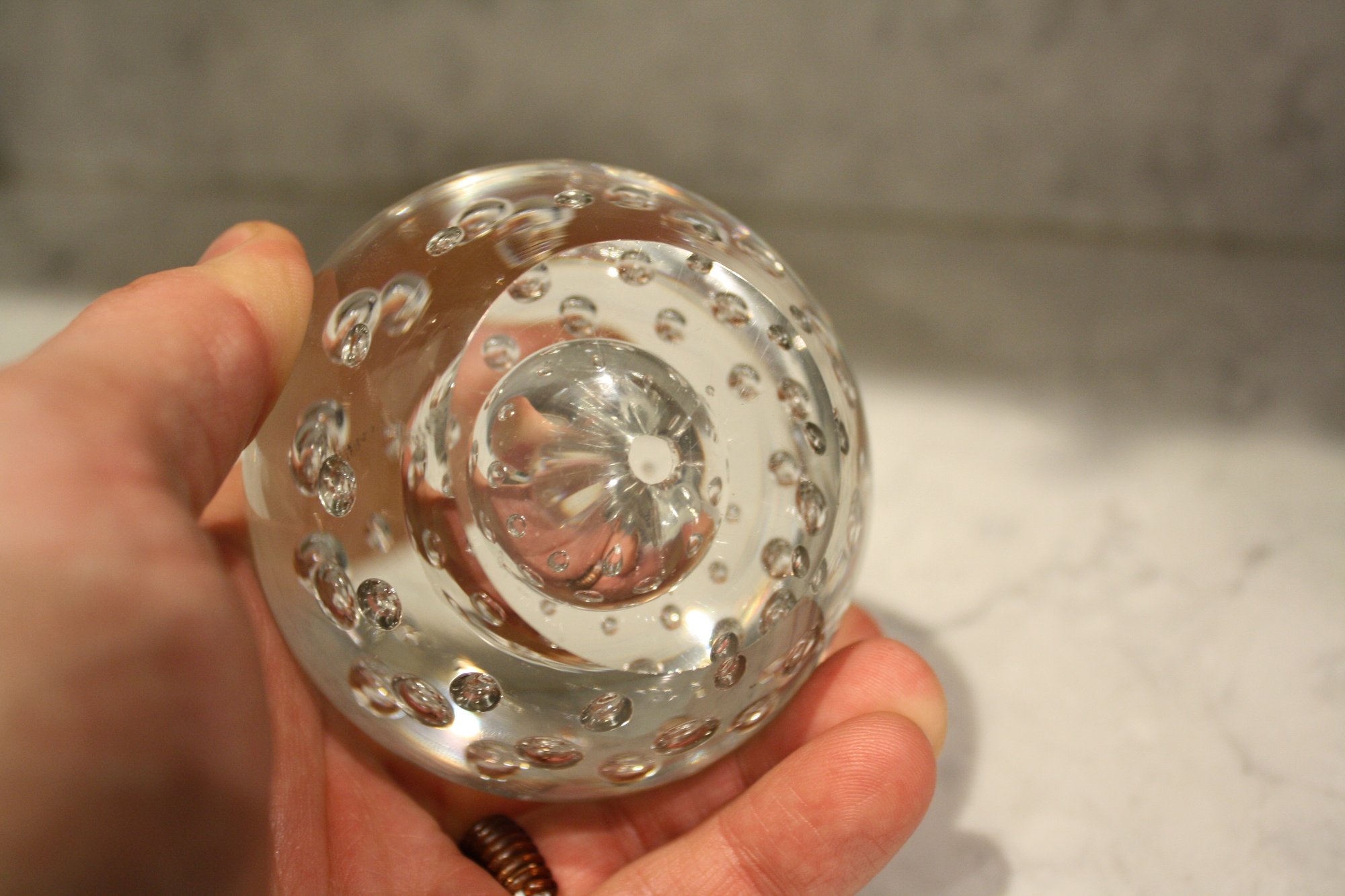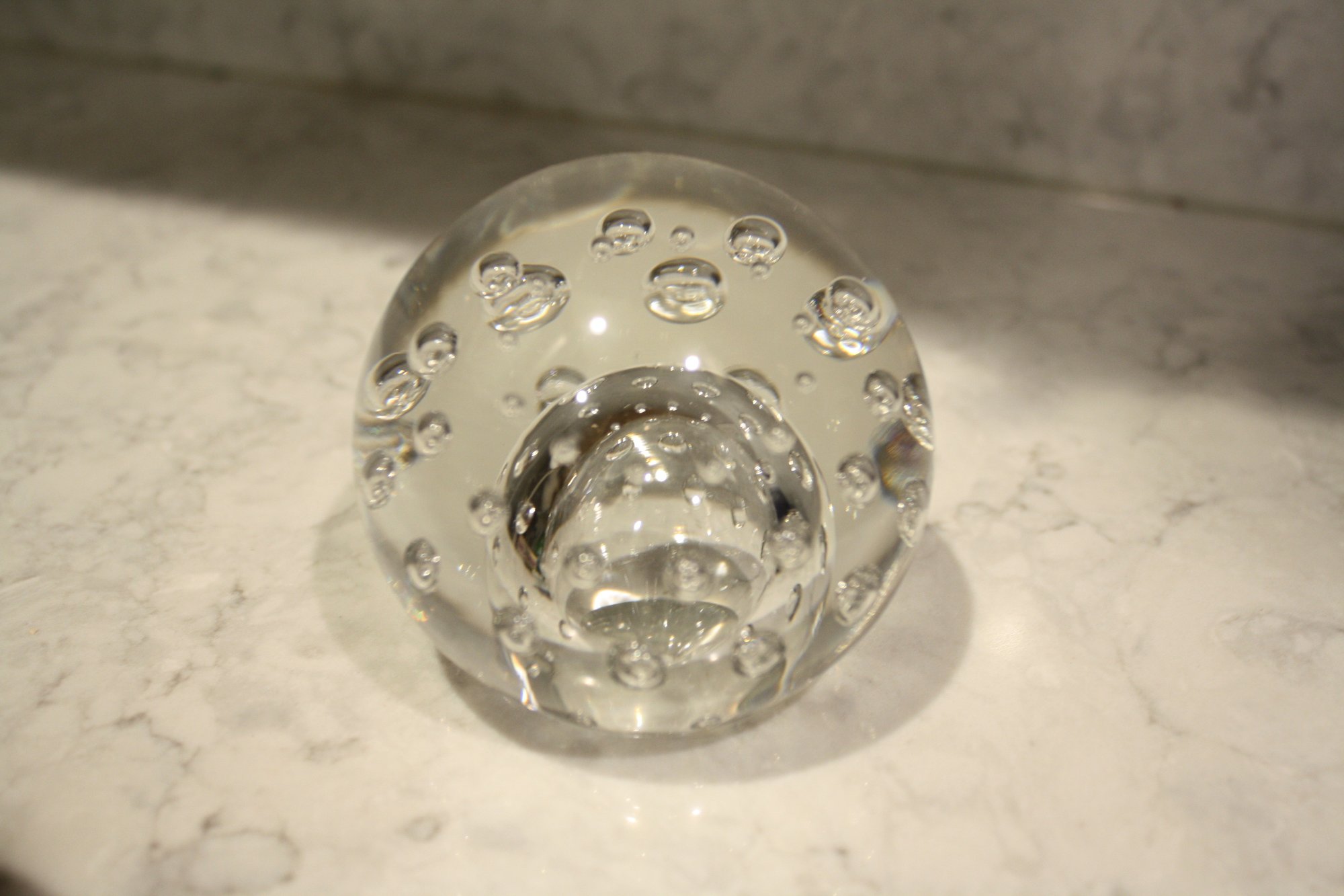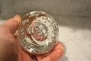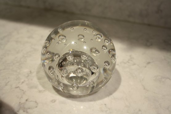 Vintage handmade spherical art glass paperweight crafted from clear crystal glass, featuring controlled internal air bubble patterns arranged in scattered or symmetrical designs, intended as a decorative desk or home décor accent piece