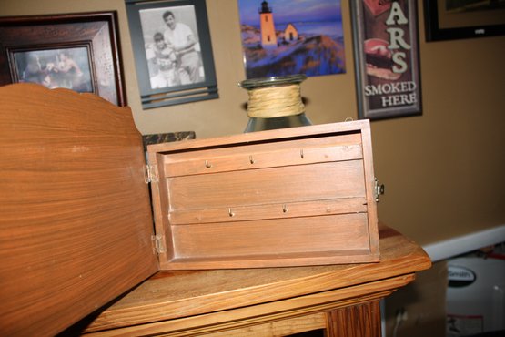 This vintage-style shadowbox wall hanging features a painted scene of two cows with the word “WELCOME” at the top. Crafted in a folk art style with a wooden frame and metal-stamped details, it includes a hidden storage compartment at the back, combining rustic charm with functional design.