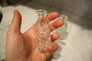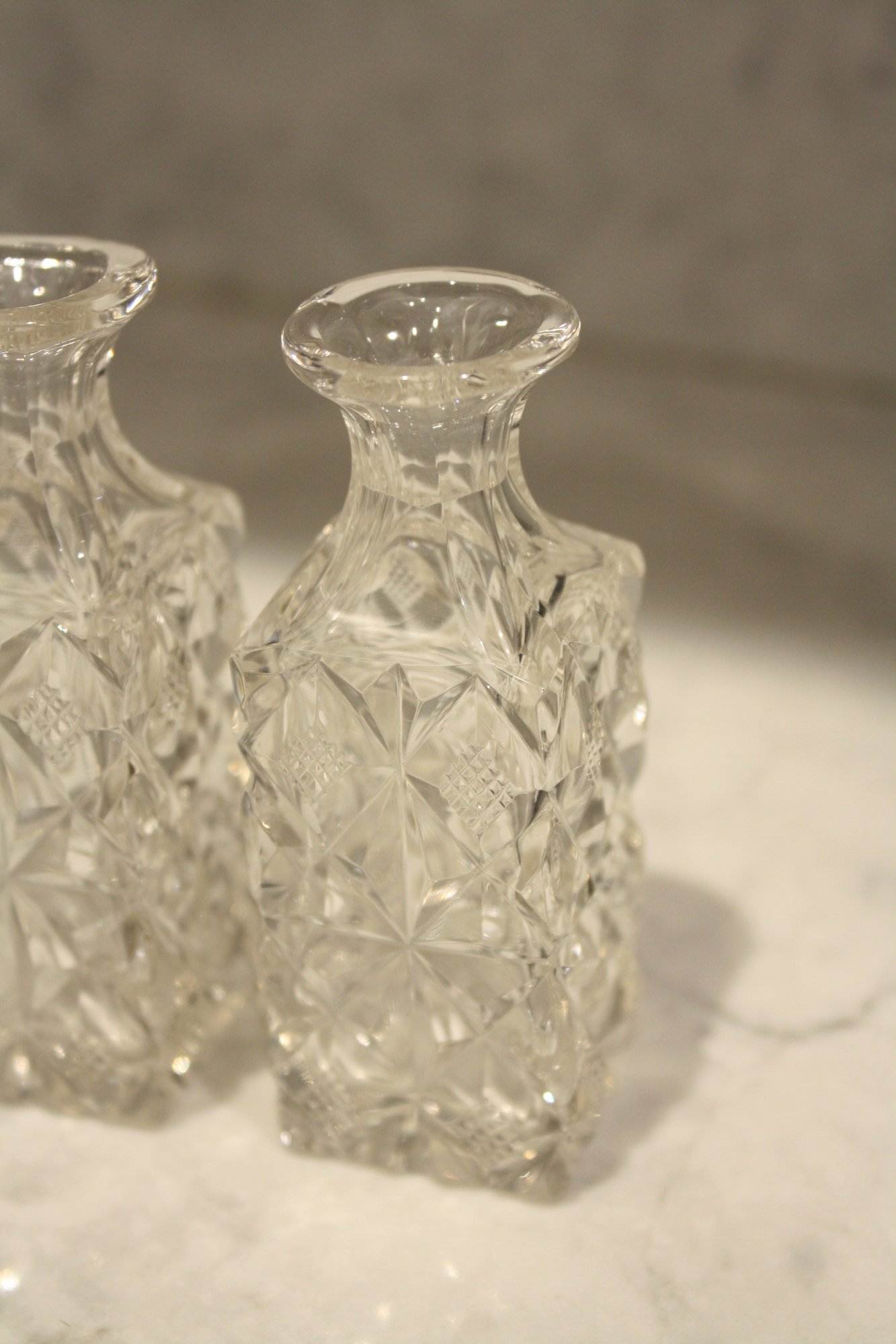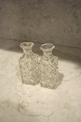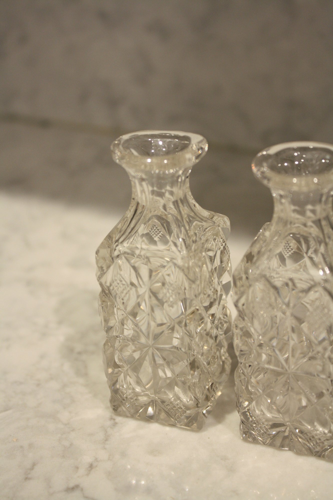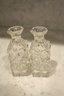 Vintage cut crystal cruet bottles featuring a diamond or hobnail cut pattern, likely part of a matching set, historically used for dining service or dressing table use as decorative storage bottles for oils, vinegar, or toiletry liquids