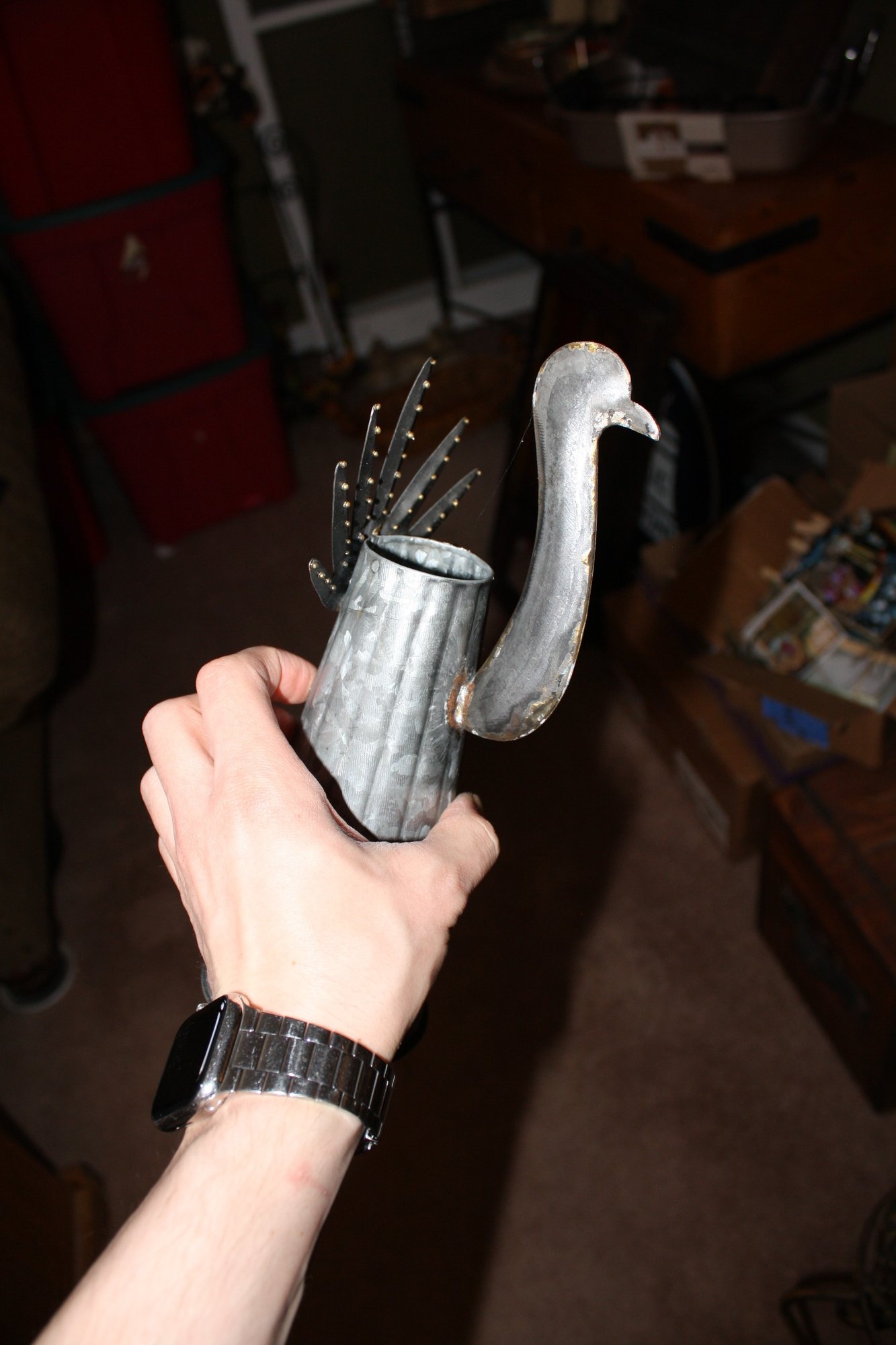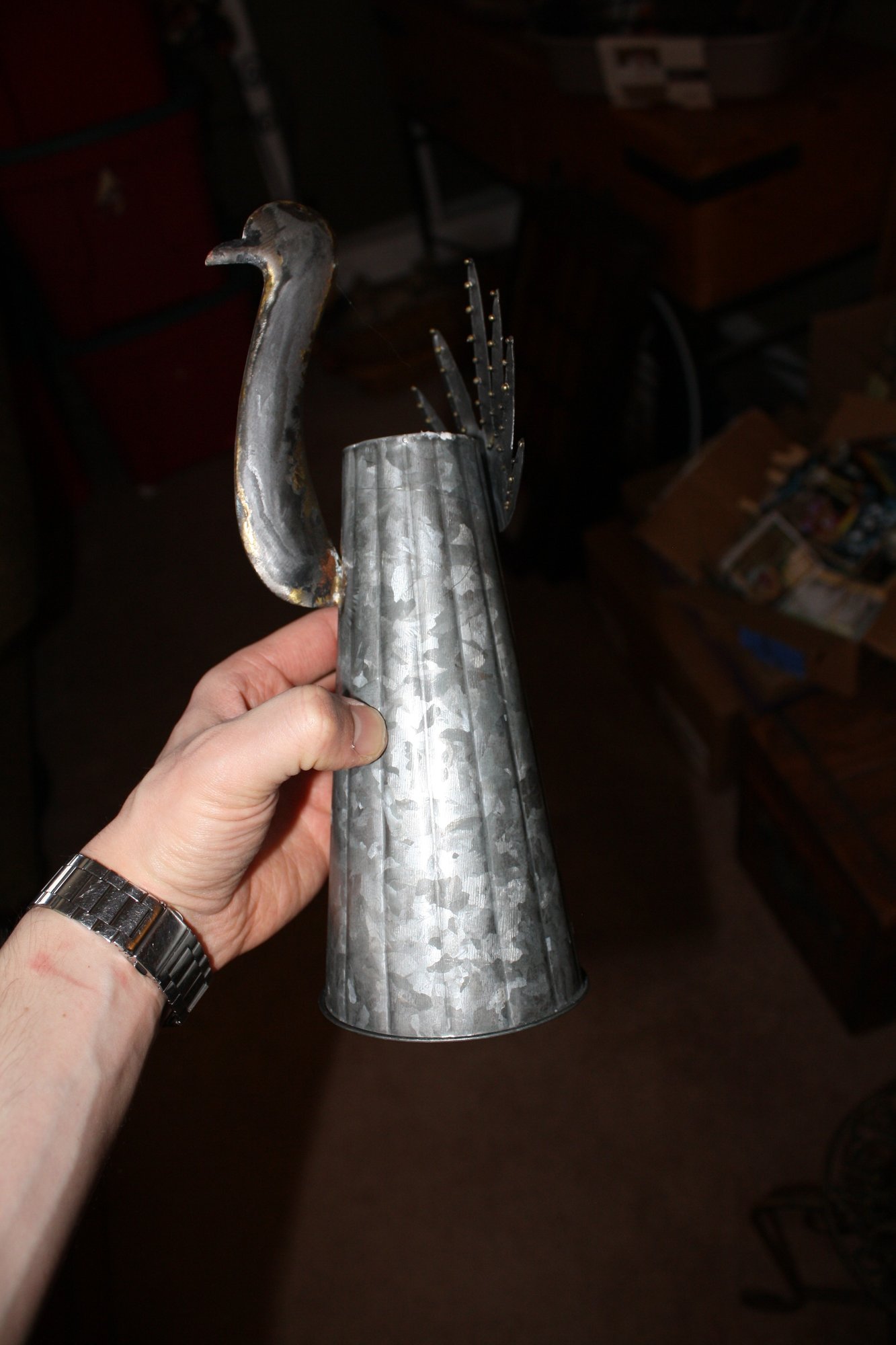 Decorative bird-shaped vase crafted from galvanized metal with a rustic industrial finish. Features a sculptural silhouette designed for tabletop display and suitable for holding dried florals or decorative stems. Lightweight metal construction with farmhouse and country-inspired styling. Ideal as a standalone accent piece or seasonal décor element.