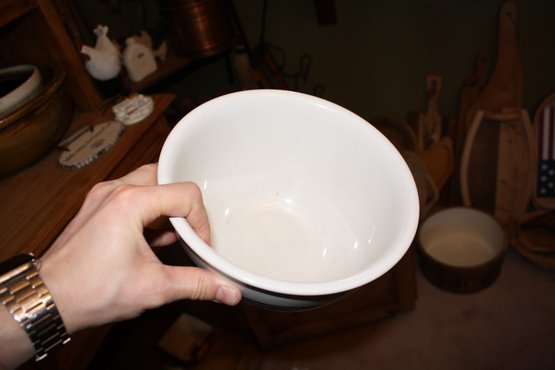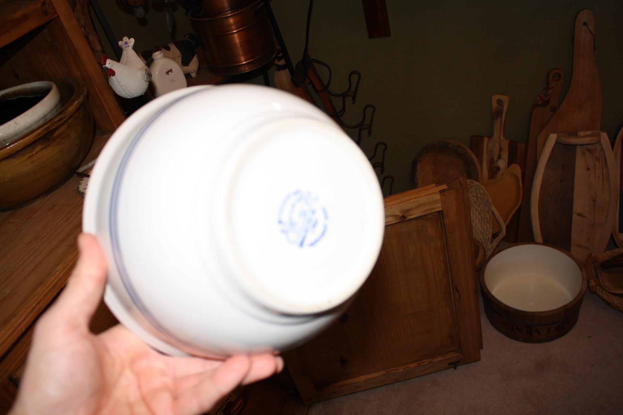 Vintage Gibson China stoneware mixing bowl featuring a classic white design with two horizontal blue stripes. Made from heavy stoneware or vitrified china in a farmhouse or “Indiana” style. Often part of a nesting set, ideal for kitchen food preparation or as a collectible decorative piece. Durable construction reflects mid-20th-century American stoneware craftsmanship.
