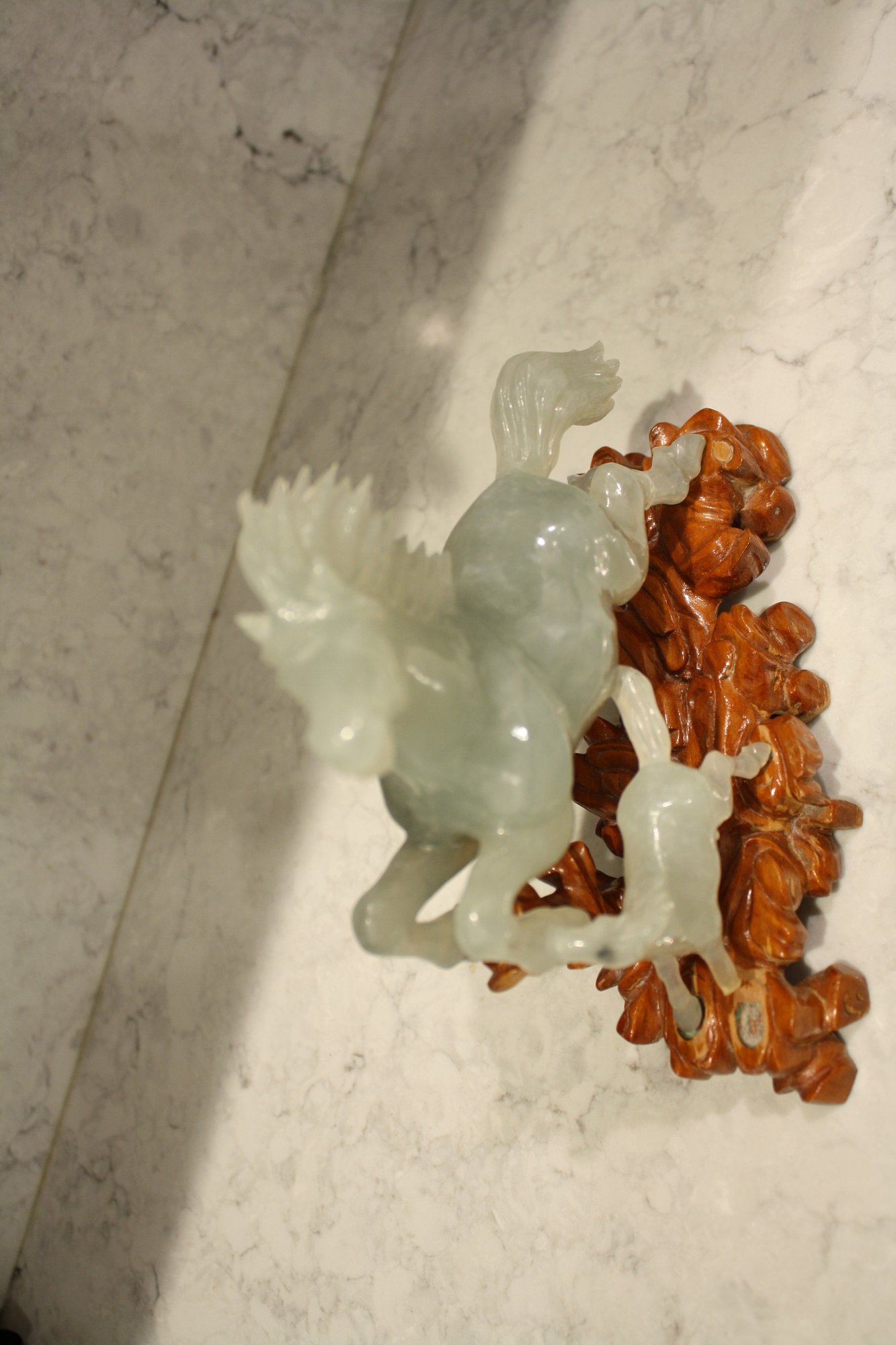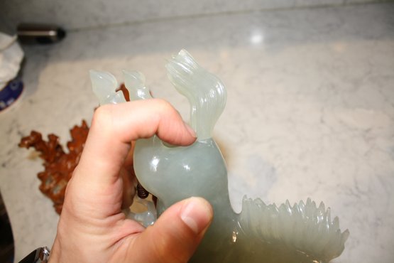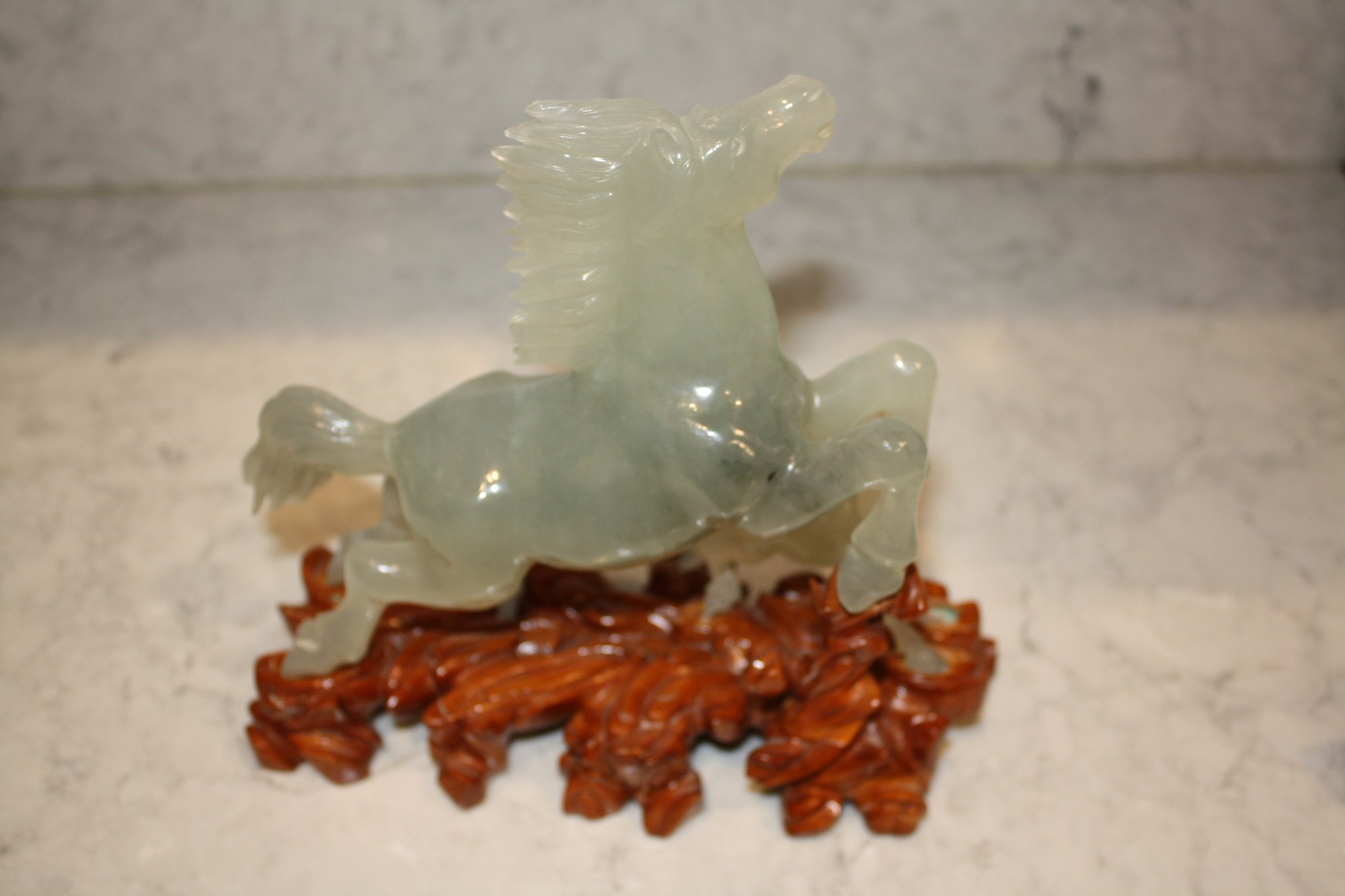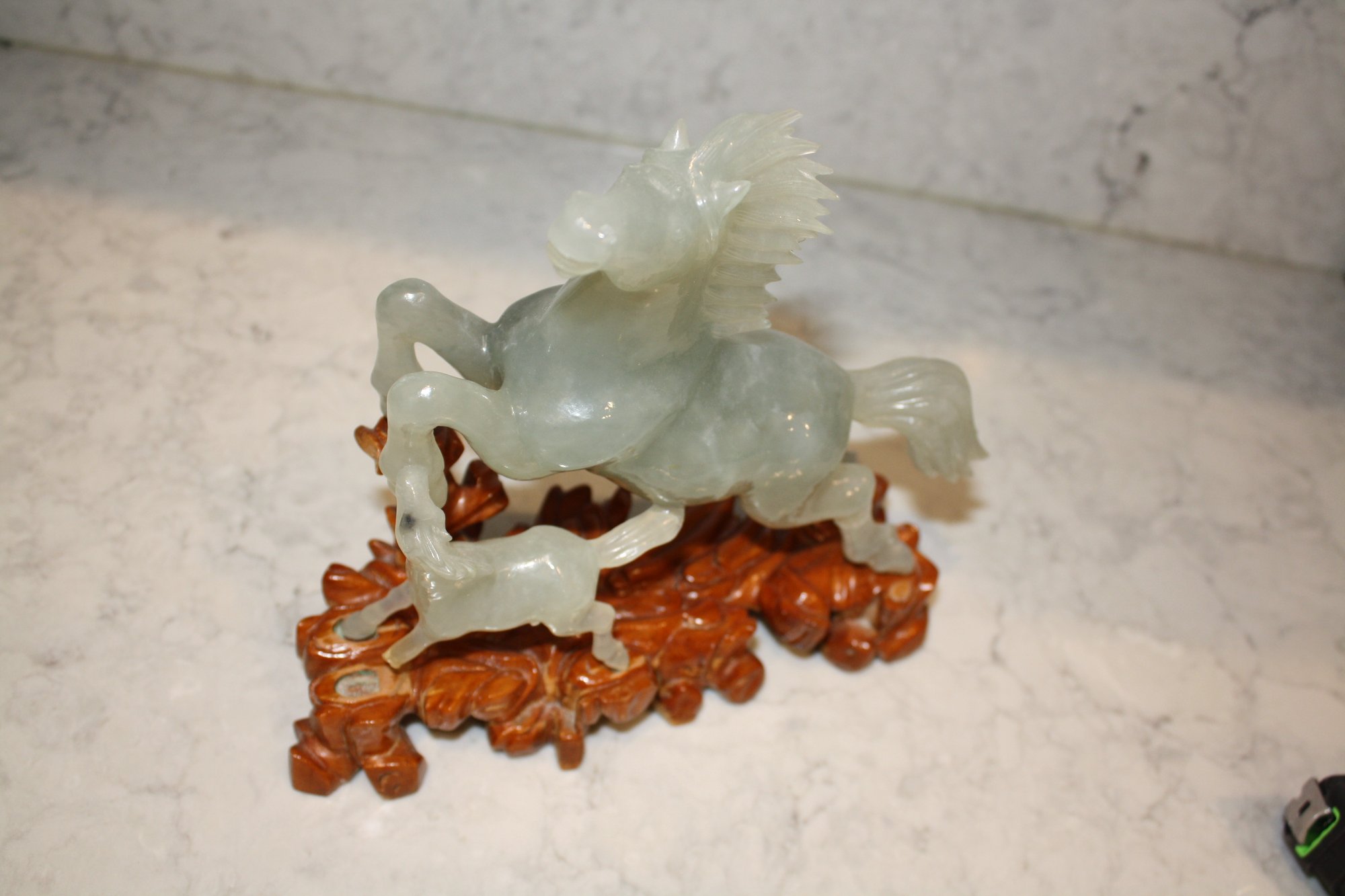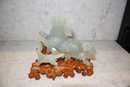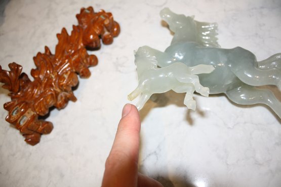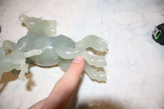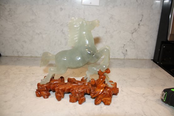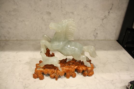 Vintage Green Jade Horse Sculpture On Wooden Base broken 6.5 inches weighs 618 grams