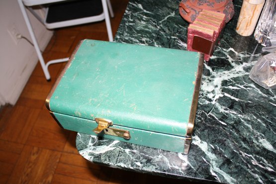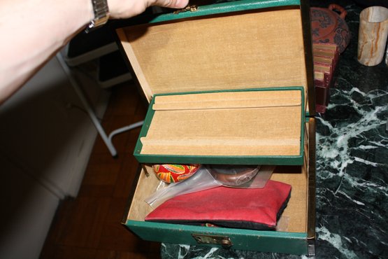 This is a vintage-style green wooden jewelry box with a tan and green felt-lined interior. The box features a hinged lid and compartmented interior suitable for organizing rings, earrings, necklaces, or small keepsakes. The exterior has a painted green finish with a classic rectangular form, making it ideal for display or everyday jewelry storage.