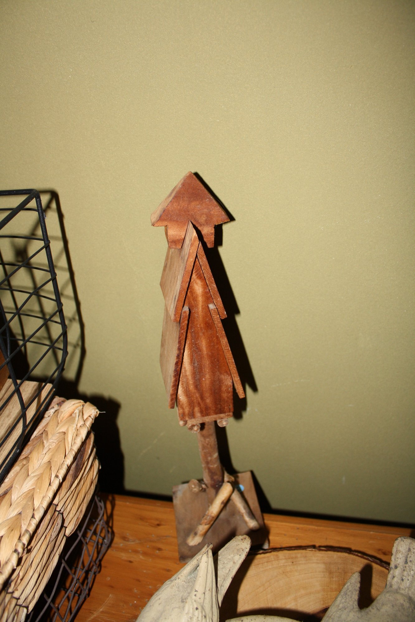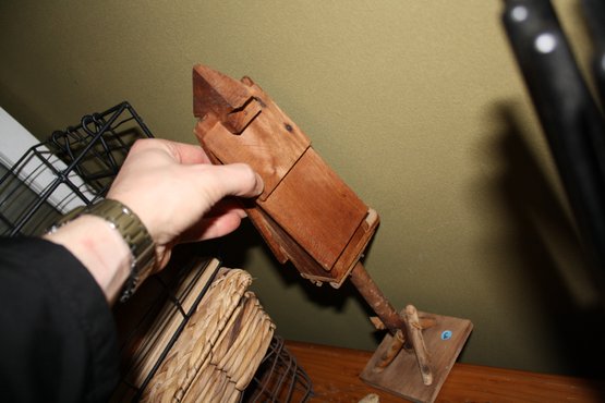 Vintage wooden folk art sculpture featuring a hand-carved multi-story or layered house design mounted on a stand. Crafted from wood with a natural or aged finish, showcasing rustic craftsmanship and folk art charm. Ideal as a decorative accent for shelves, mantels, or display areas.