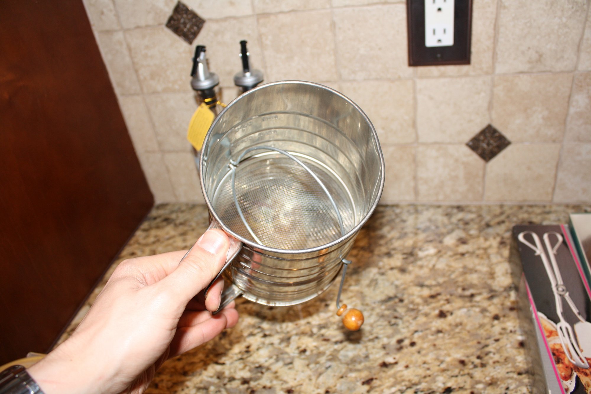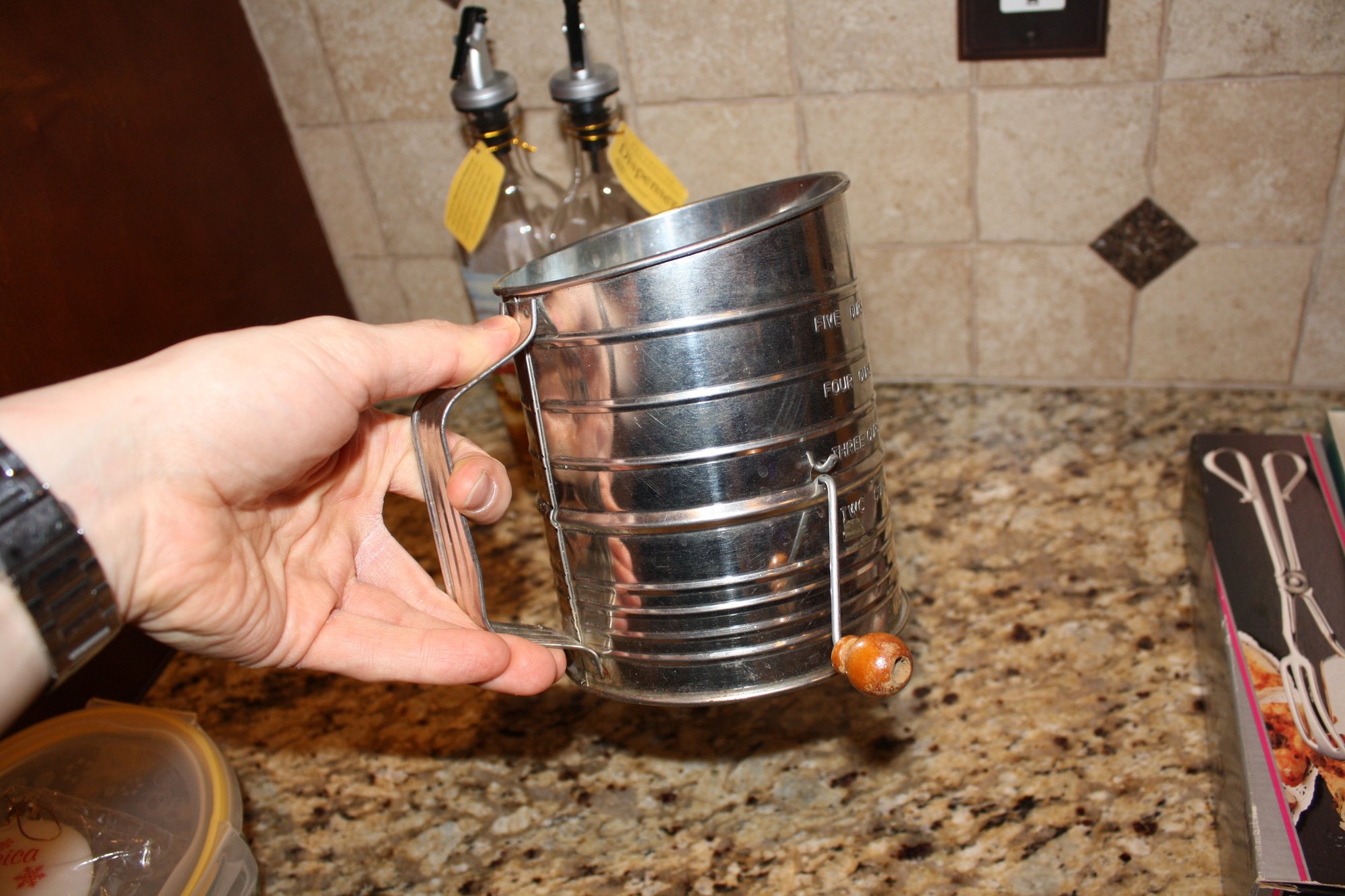 Vintage hand-crank flour sifter constructed from tin or stainless steel, featuring a rotary whisk agitator operated by a wooden knob handle. The sifter is designed to aerate flour and powdered sugar, break up lumps, and includes measurement markings for precise ingredient portions, combining classic mechanical operation with durable metal construction.