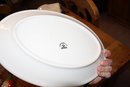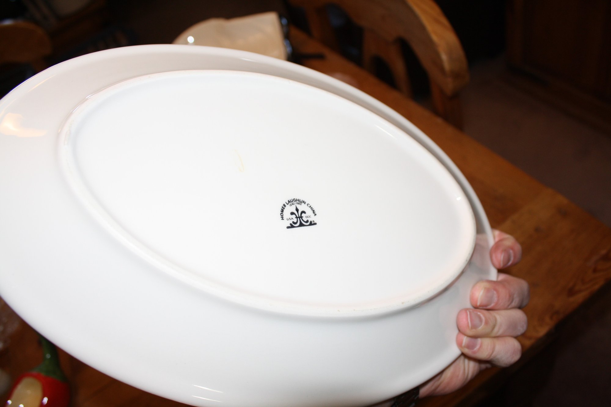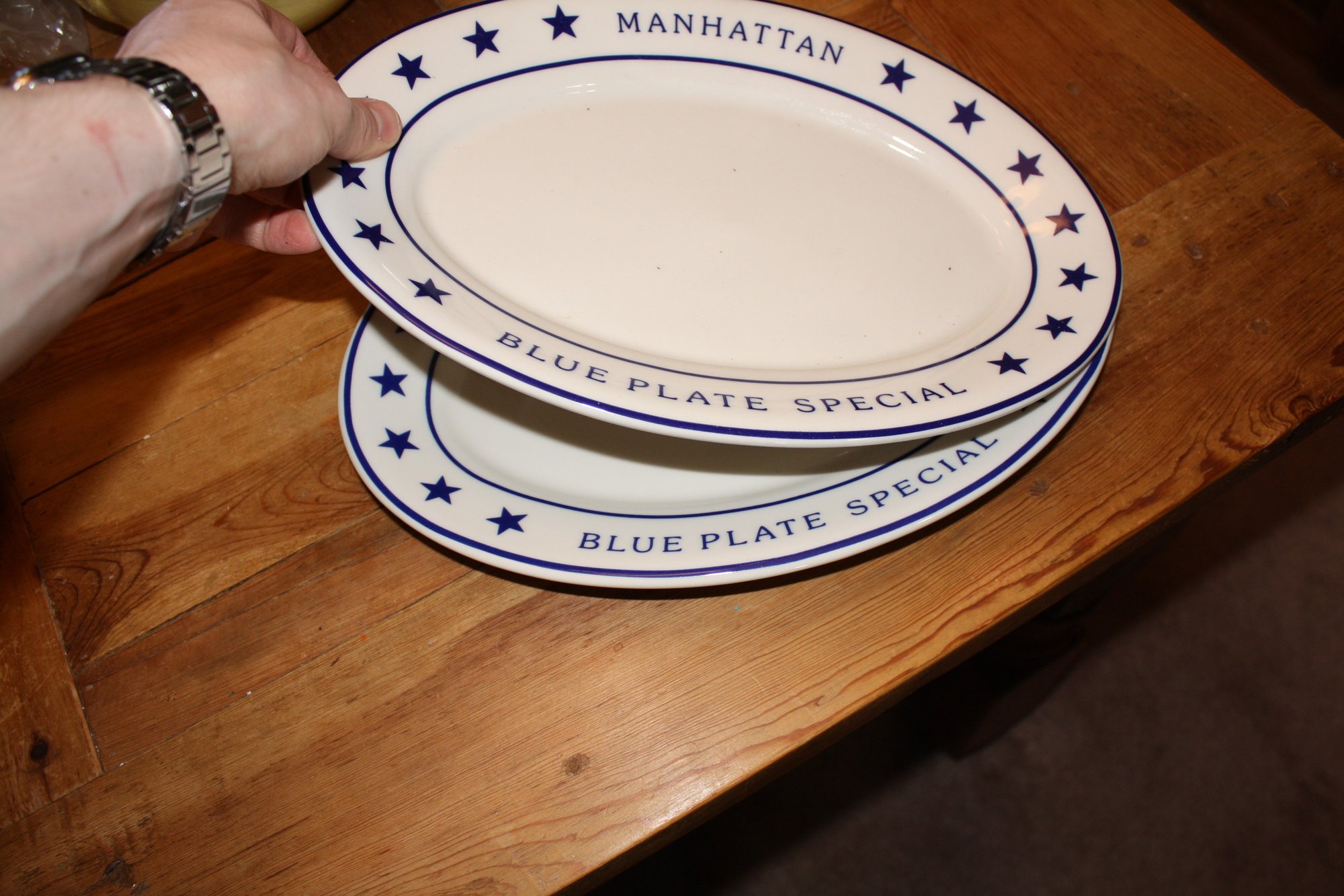 Vintage oval platter by Homer Laughlin China Company featuring a white base with a blue decorative band, stars, and the text “MANHATTAN BLUE PLATE SPECIAL.” Made from durable, high-fired ceramic, designed as restaurant ware. Collectible piece, ideal for display, serving, or as part of vintage American diner tableware collections. Value depends on condition, including scratches or chips.