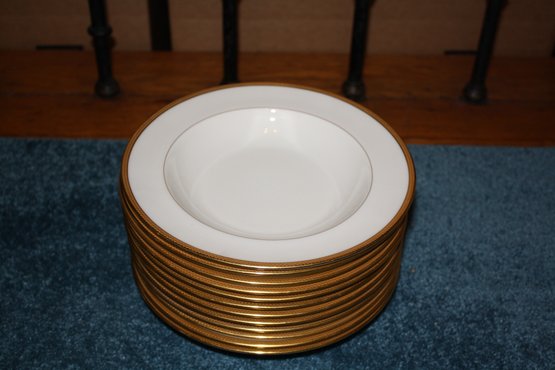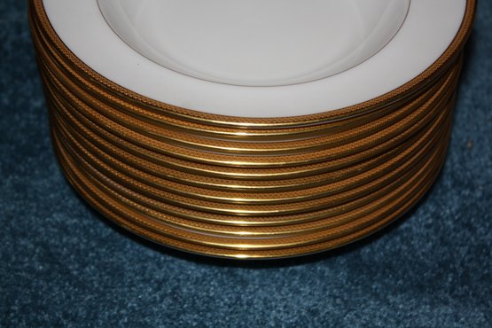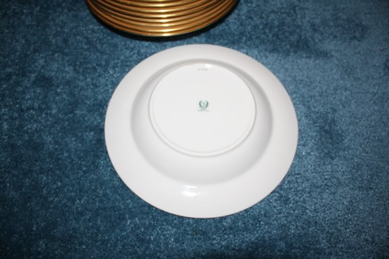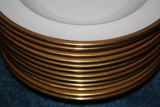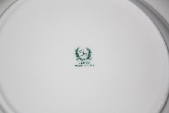 This vintage Lenox dinner plate is made of high-quality ivory porcelain with gold gilt trim and features an intricate decorative border. Marked with a green Lenox backstamp, it was made in the USA and measures approximately 8.5 inches in diameter, making it a collectible piece of fine dinnerware.