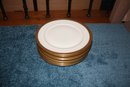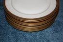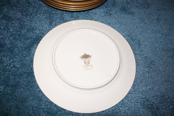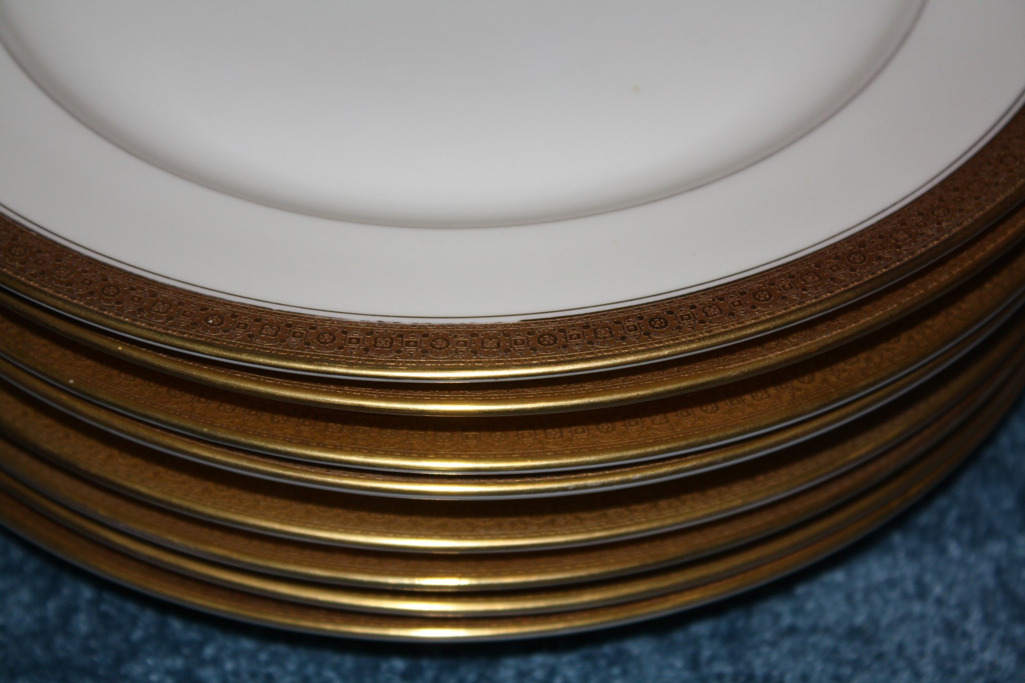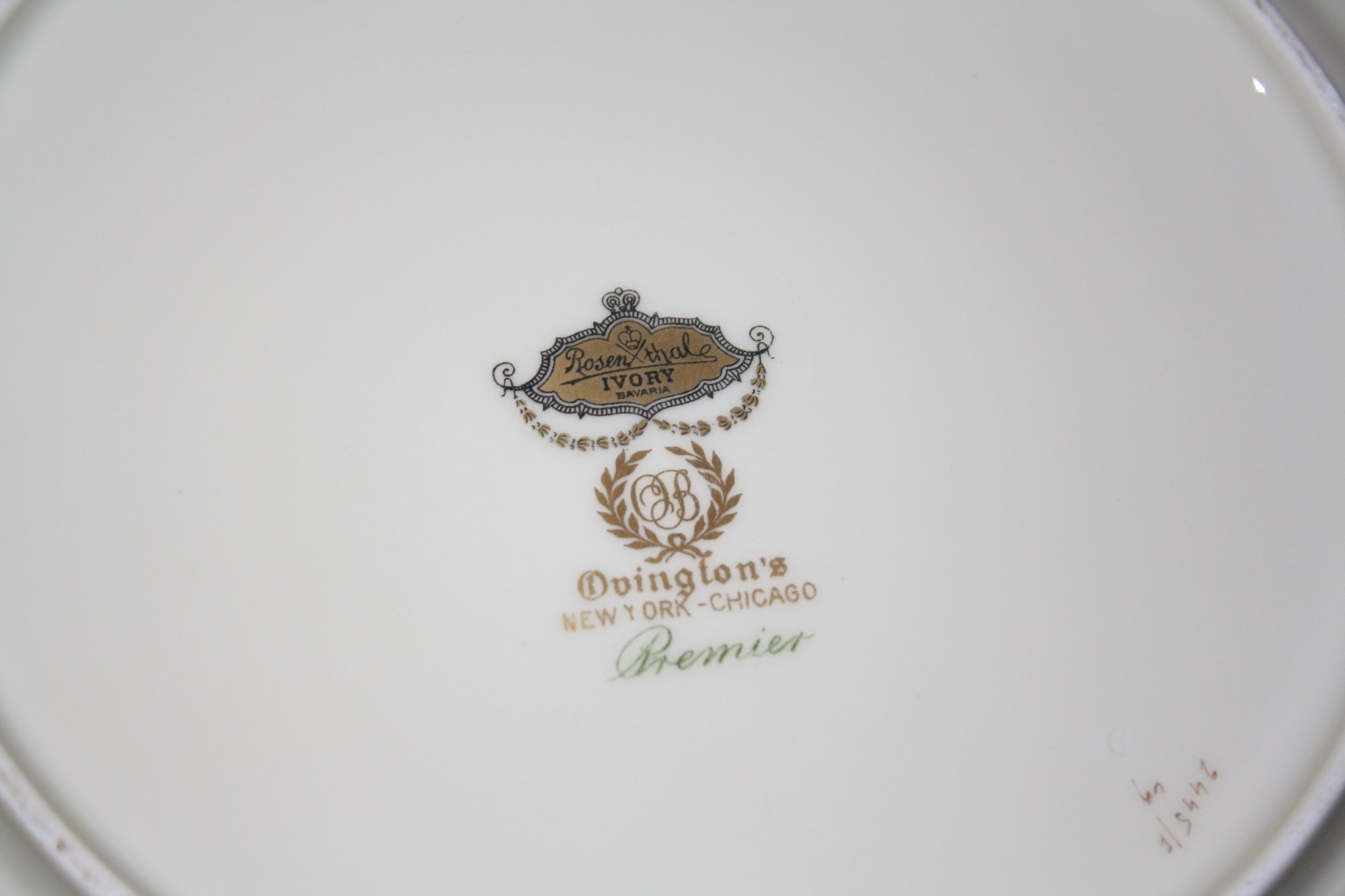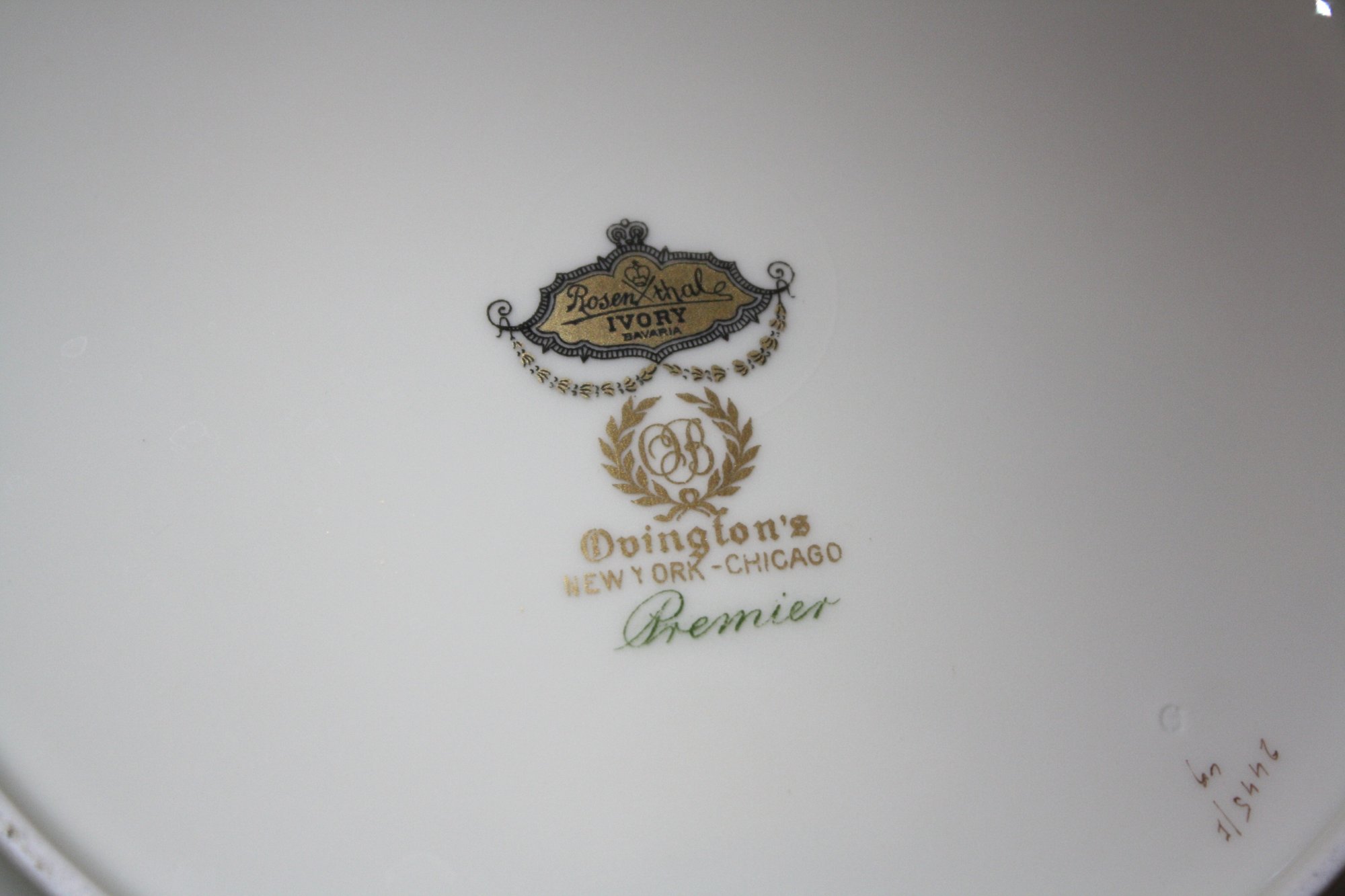 This vintage Rosenthal Ivory Bavaria porcelain dinner plate, retailed by Ovington’s, features a 9.5-inch diameter with elaborate coin gold decoration and a laurel leaf patterned gold-gilt trim. Part of the Ivory/Premier line, it is a collectible piece of fine English-German porcelain suitable for display or formal dining.