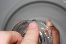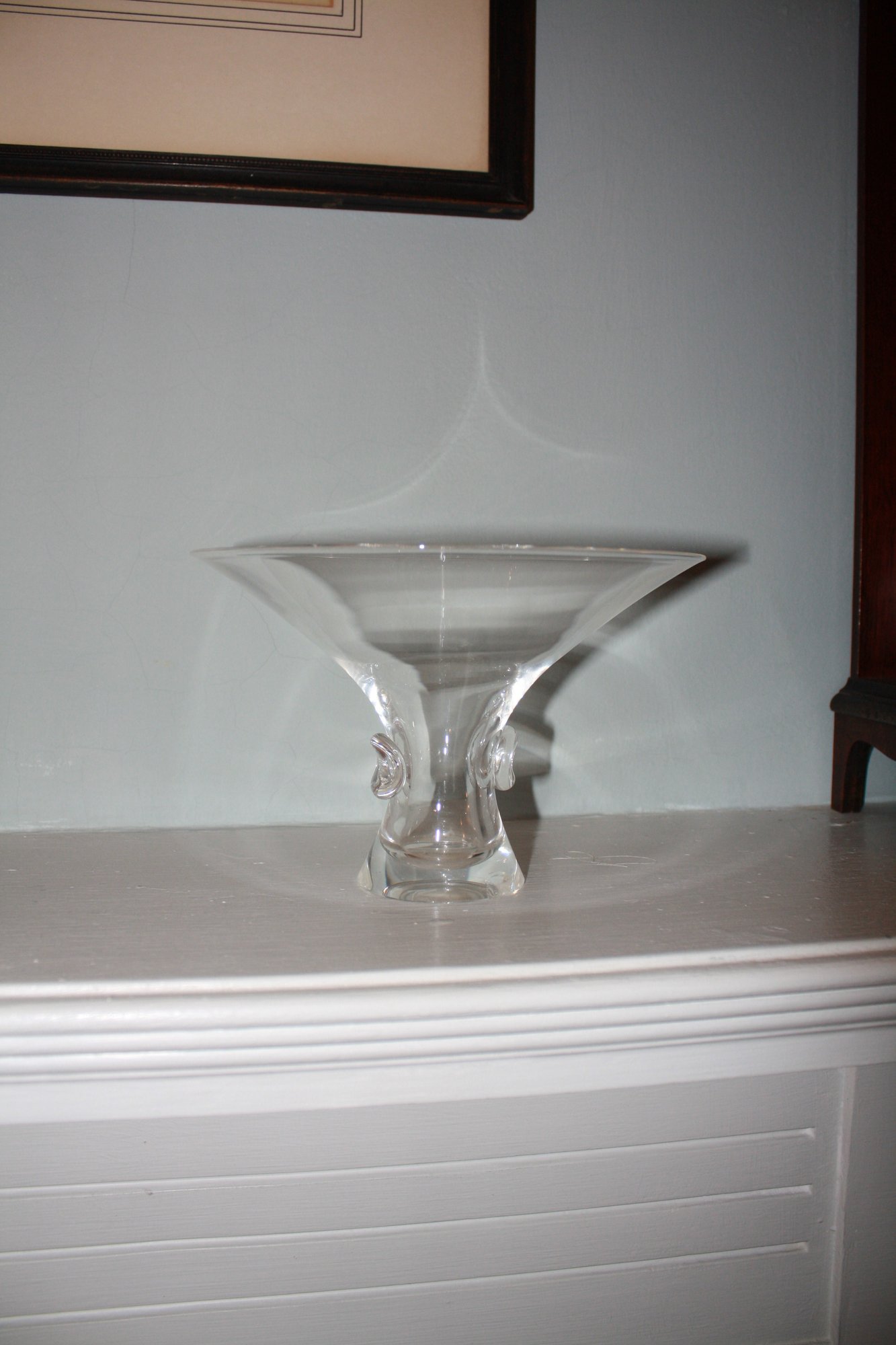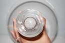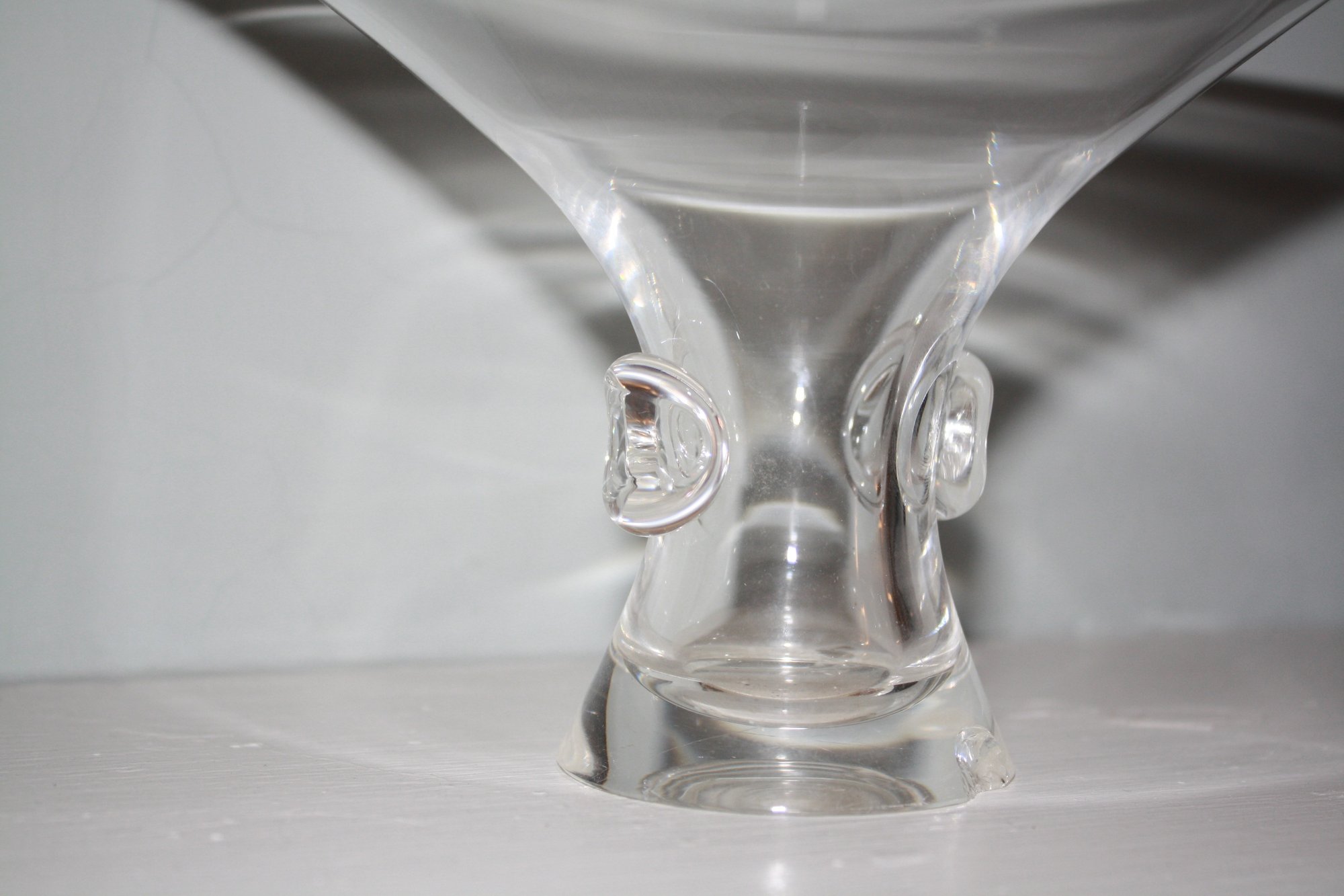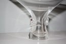 Vintage Steuben “Bouquet” vase model #7985 crafted in fine American crystal glass, designed circa 1949–1950 with a wide flared rim, cinched waist form, applied circular thumbprint prunts on the sides, hand-etched Steuben signature on the base, measuring approximately 5 inches tall and 8 inches in diameter.