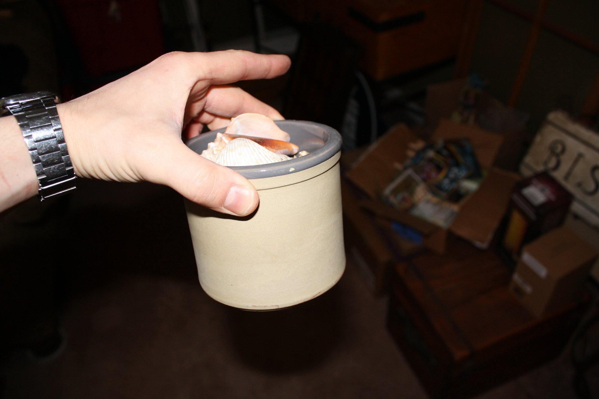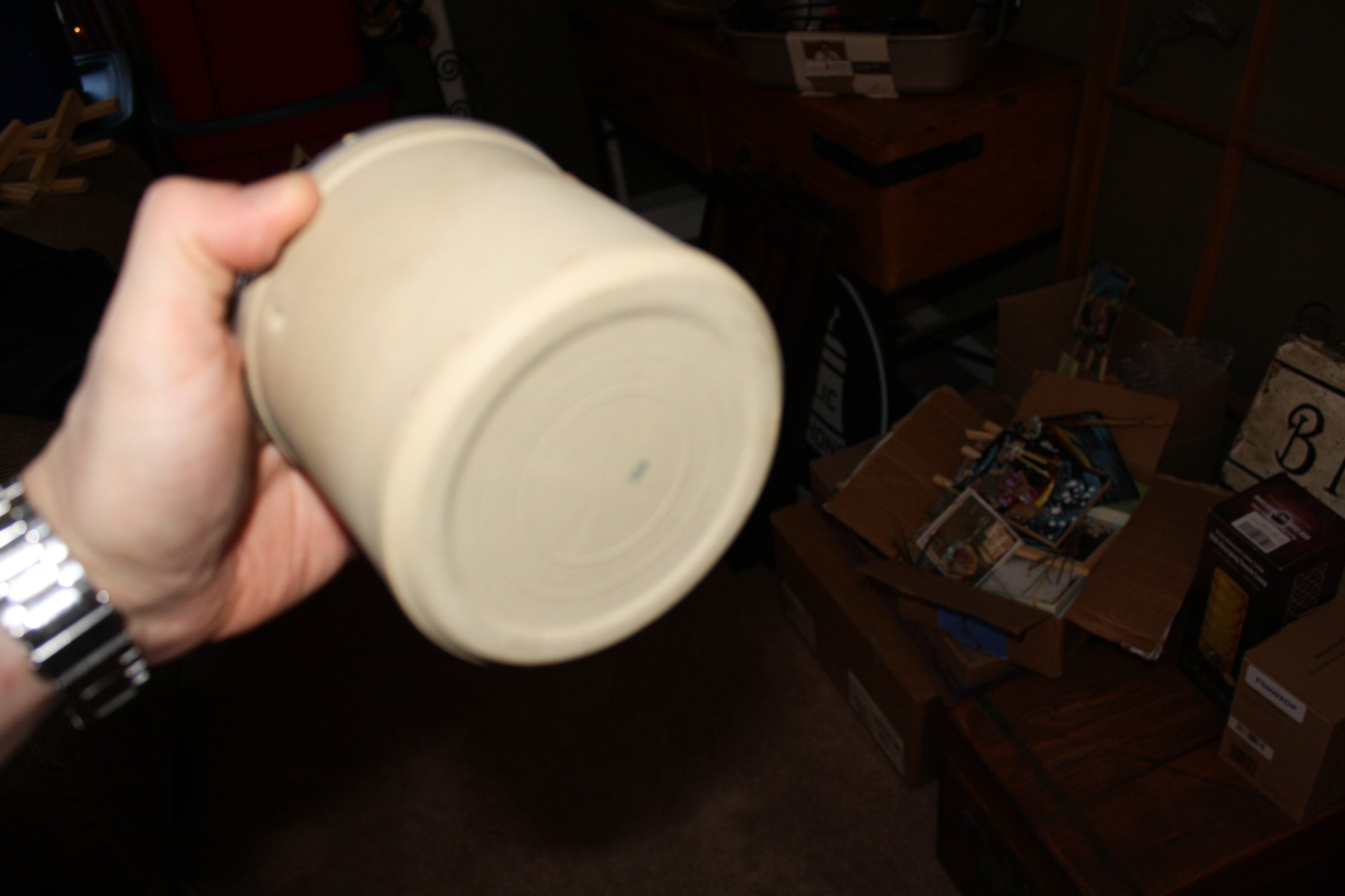 Vintage stoneware canister designed for kitchen storage or decorative display. Traditional cylindrical form suitable for storing dry goods such as flour, sugar, or coffee. Neutral finish with classic utilitarian styling consistent with early kitchen containers. Solid construction appropriate for both functional use and farmhouse or rustic décor settings.