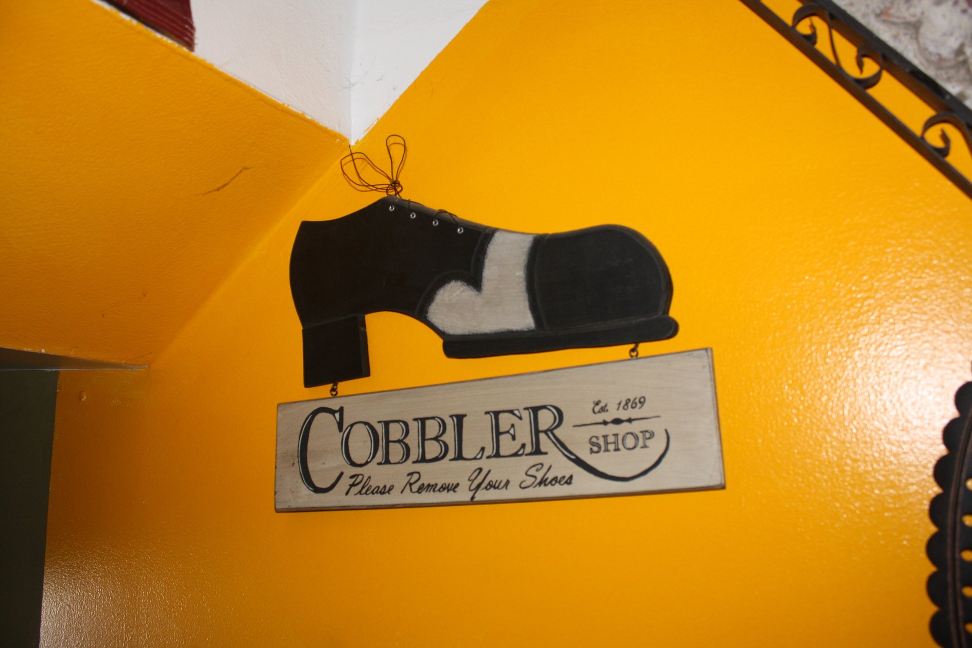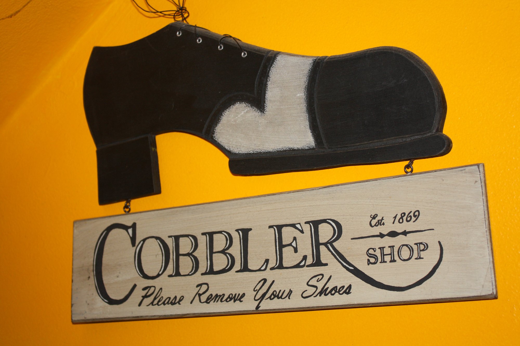 Decorative vintage-style sign for a cobbler shop established in 1869, featuring the instruction “Please Remove Your Shoes.” Ideal as collectible advertising memorabilia or as rustic, nostalgic home or shop decor.