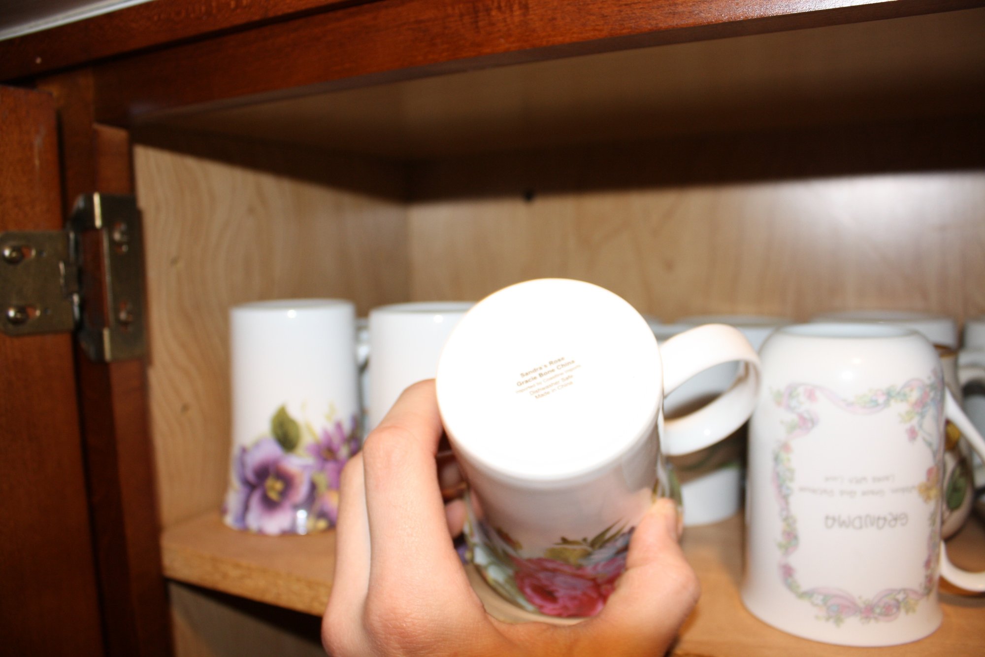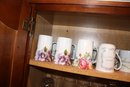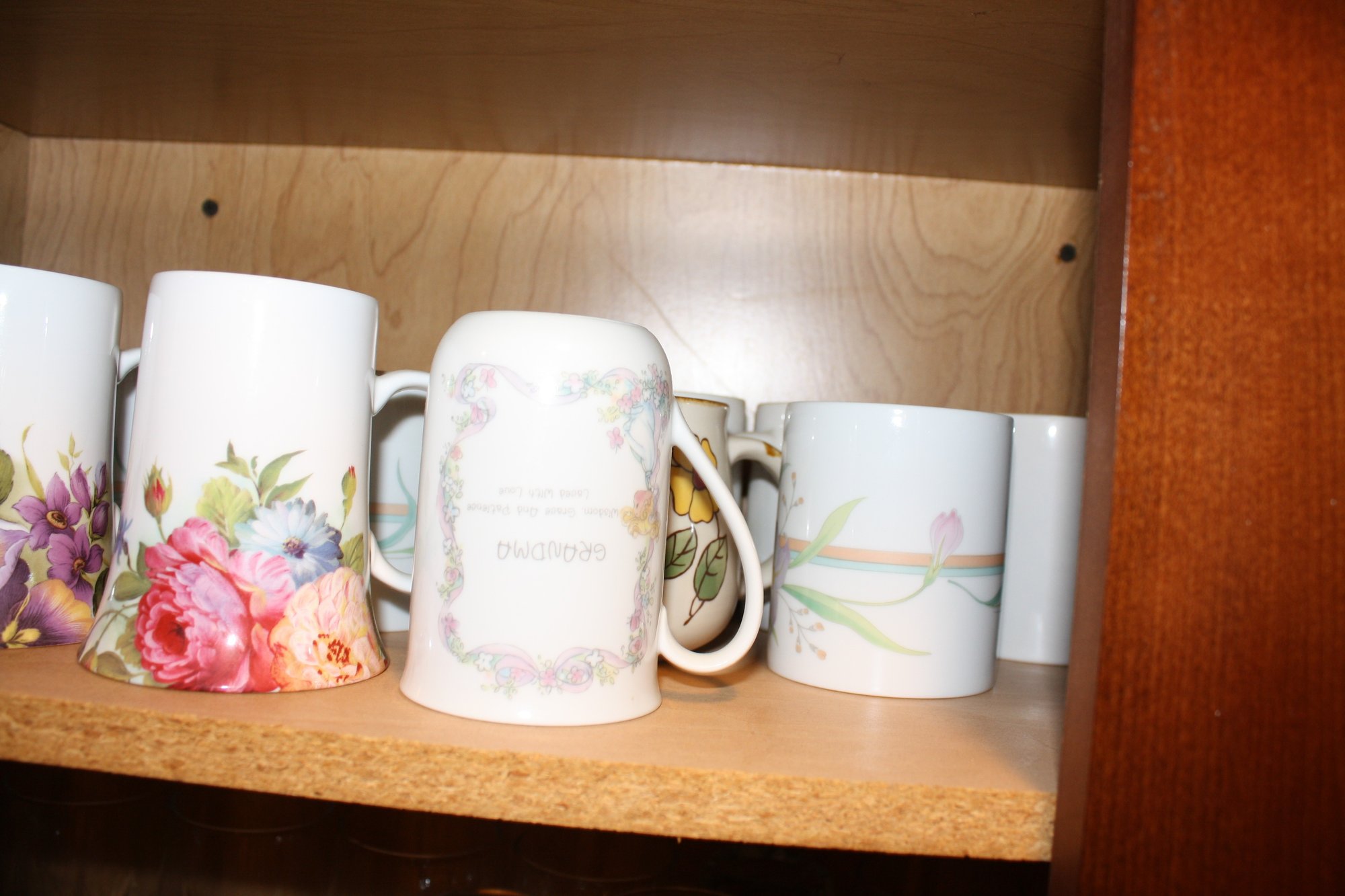 Collection of vintage-style porcelain mugs featuring detailed floral patterns including pansies and roses, alongside a souvenir mug labeled “Grandma.” Each mug showcases a smooth glazed finish with colorful botanical designs and decorative lettering, combining collectible charm with classic porcelain craftsmanship.