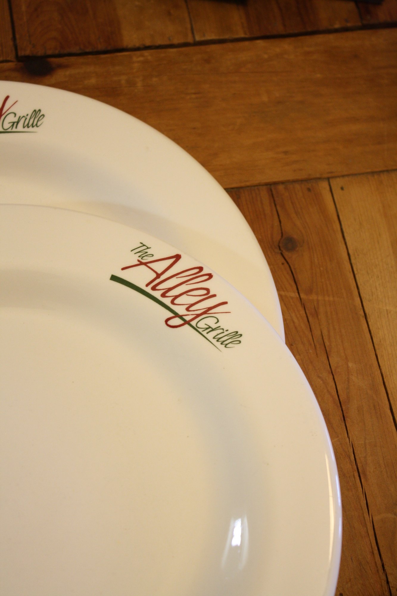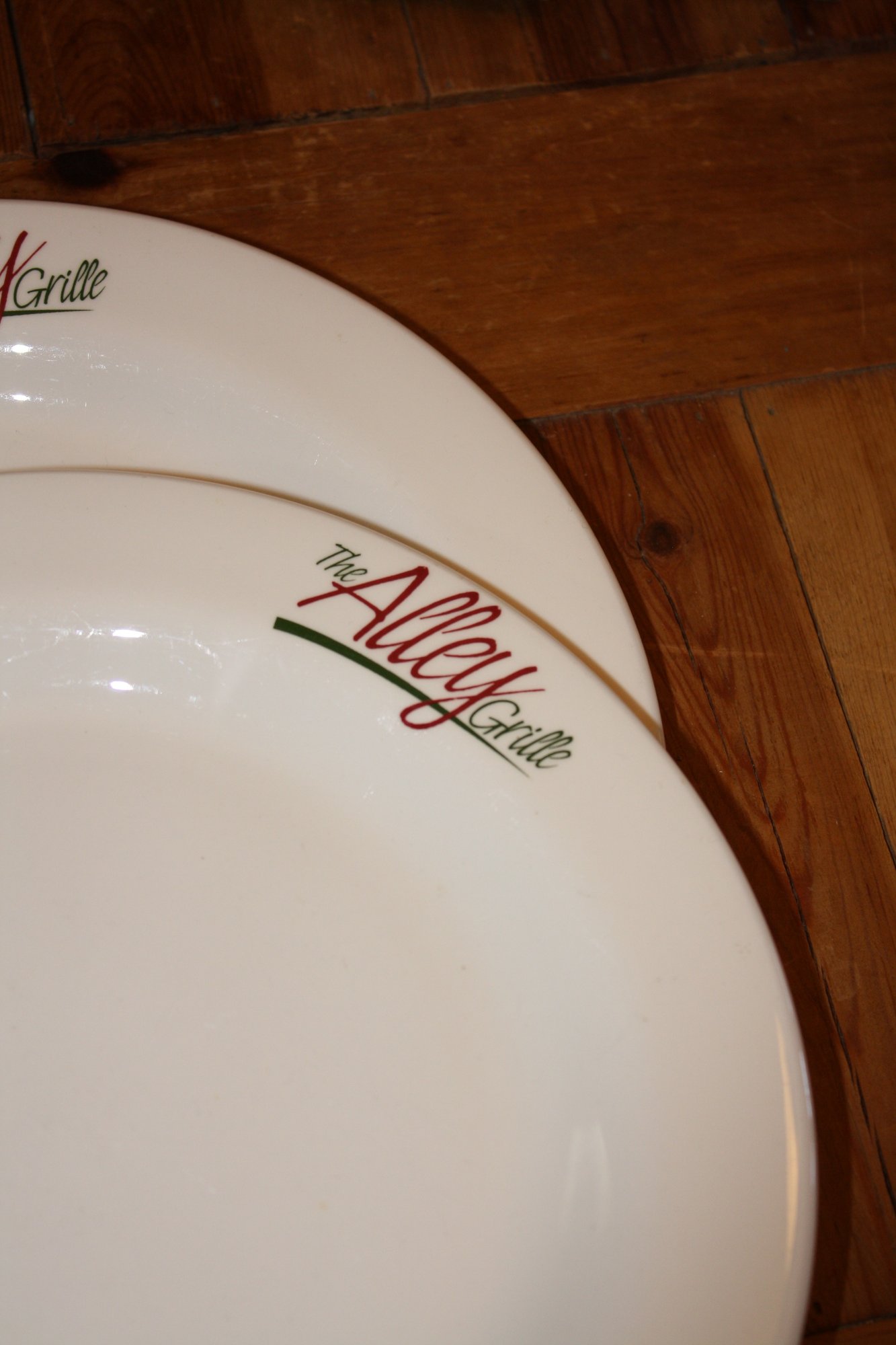 Vintage ceramic dinnerware plate from The Alley Grill featuring a white base with a prominent black and red logo on the rim. Collectible restaurant ware suitable for serving food or display purposes. Durable and branded piece, ideal for collectors of vintage restaurant memorabilia or ceramic tableware.