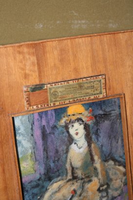 Framed artwork featuring a vintage Union-made cigar box label from the Cigar Makers' International Union of America, combined with a decorative image of a young girl holding an umbrella in a Fauvist-inspired style. Mounted in a wooden frame with decorative stickers or labels on the matting. Collectible and decorative piece ideal for display, combining vintage cigar advertising with artistic presentation.