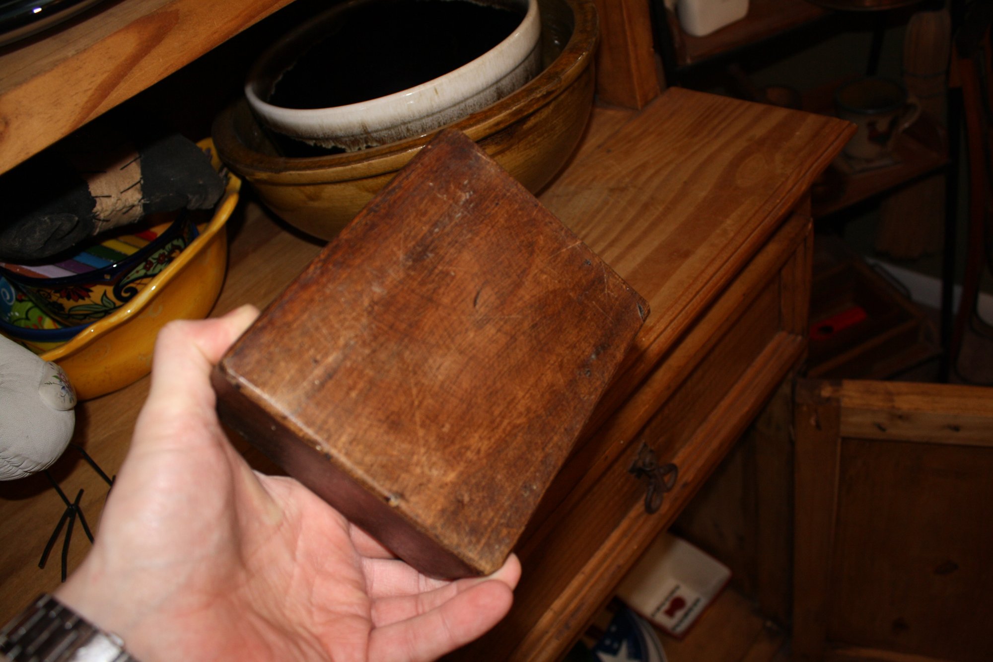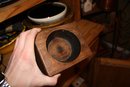 Vintage wooden primitive sugar mold, originally used as a single-hole mold for sugar or in small industrial foundries. Made from solid wood with natural signs of age and wear, featuring a central circular cutout. Repurposed today as a decorative centerpiece, candle holder, or rustic home décor accent, ideal for farmhouse, industrial, or vintage-inspired interiors.