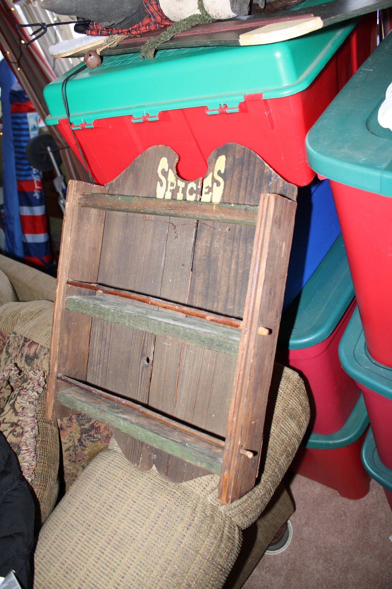 Vintage wooden wall-mounted rack designed for displaying small spice jars or collectible souvenir spoons. Features horizontal rods or notches to hold items securely and decorative carved or scalloped edges. Top section labeled “SPICES,” ideal for organizing kitchen spices or adding a rustic decorative touch.