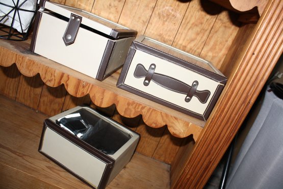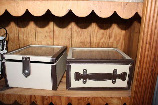 This multi-purpose decorative storage box features a white leatherette-style body with dark brown trim and stitching, a clear top window for visibility, rectangular shape with handles for easy portability, and lid straps to secure contents, perfect for organizing cosmetics, office supplies, or small personal items on desktops, shelves, or vanity areas.
