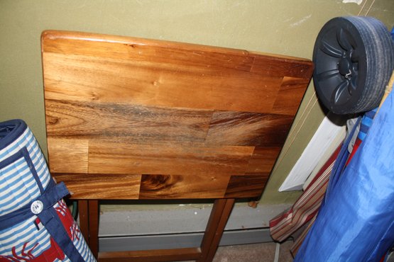 Wooden folding accent table featuring a collapsible design for easy storage and portability. Constructed from wood with a flat top surface suitable for use as a side table, plant stand, or small utility table. Compact and lightweight design ideal for indoor or occasional outdoor use. Pre-owned condition; please refer to photos for dimensions and overall wear.